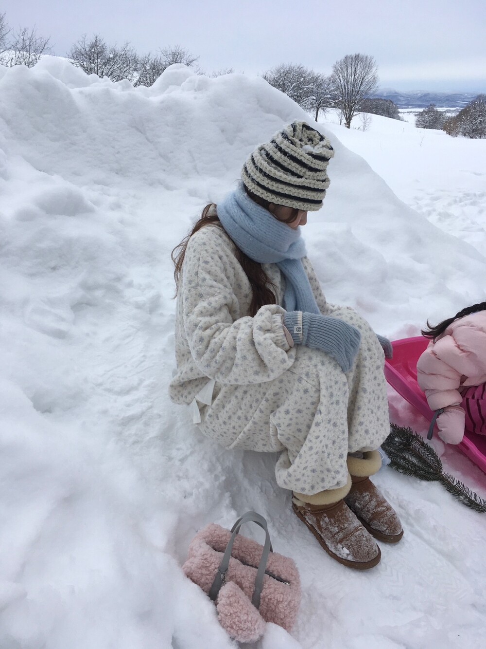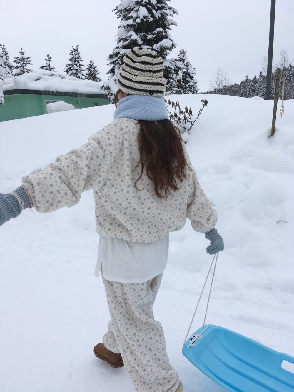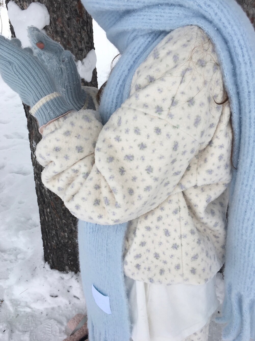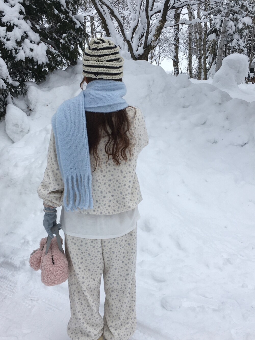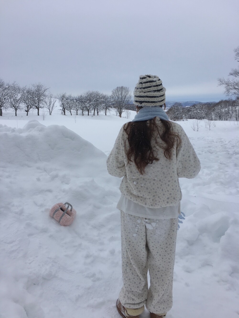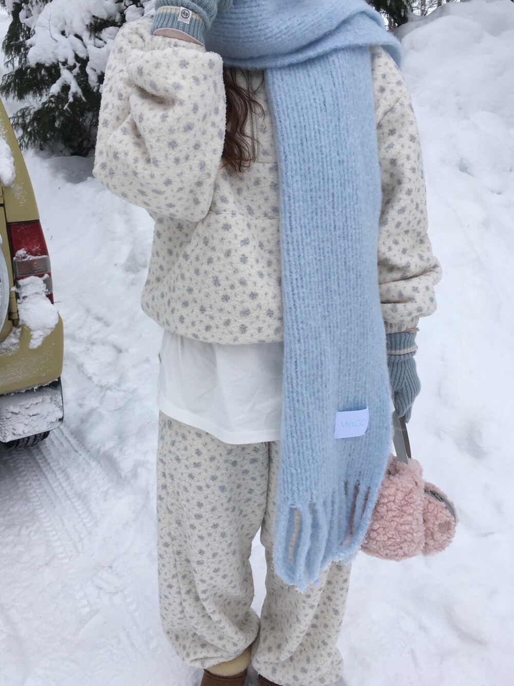 라벤더톤 잔꽃 패턴이 은은하게 들어간, 겨울에 딱 좋은 포근한 보아 소재 조거 팬츠예요.
