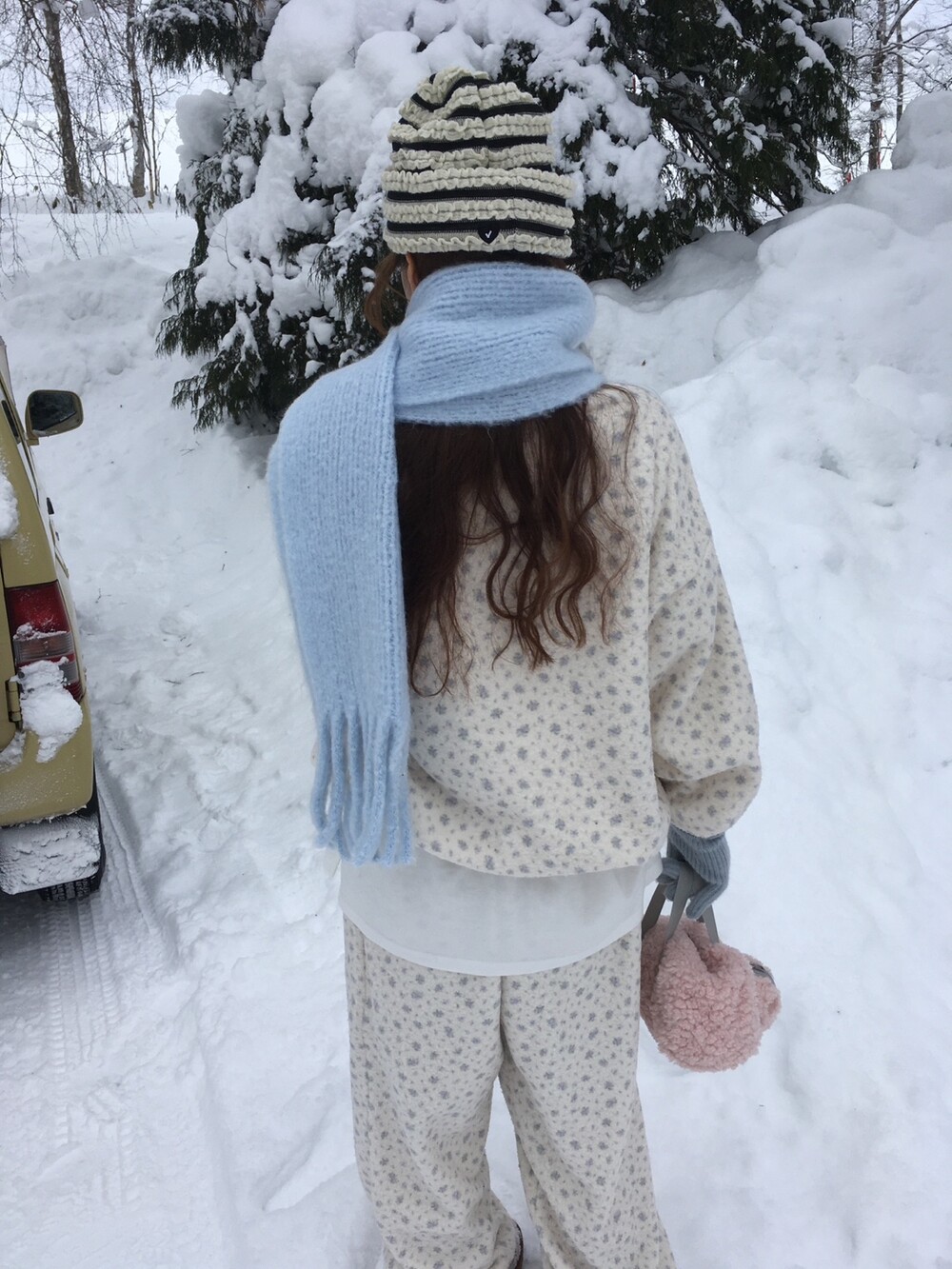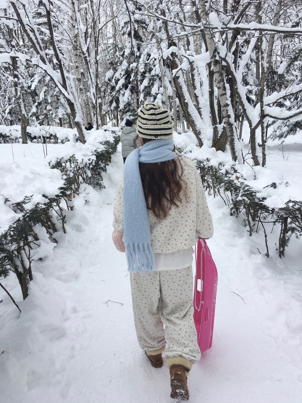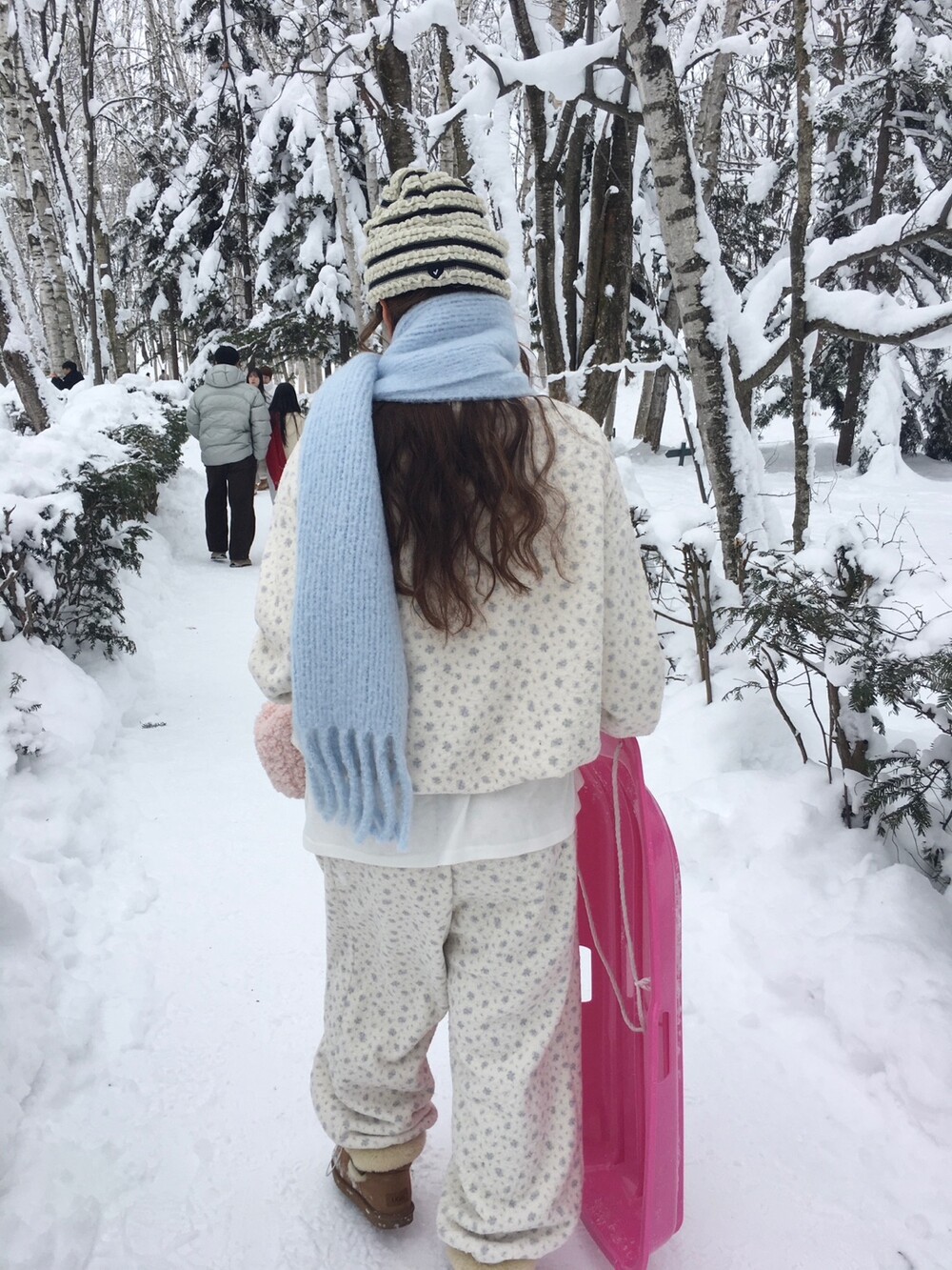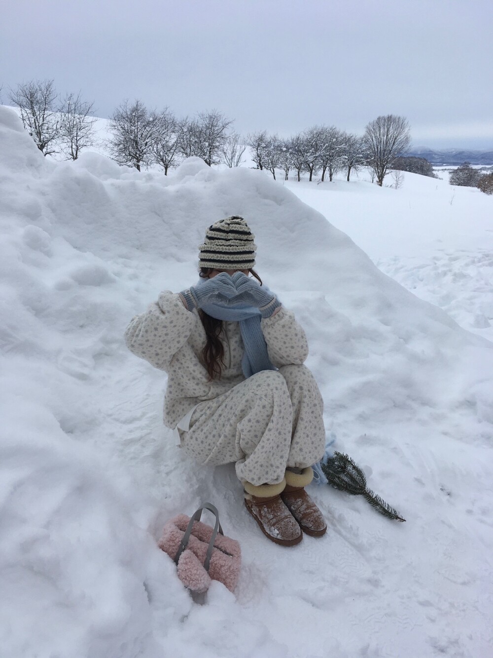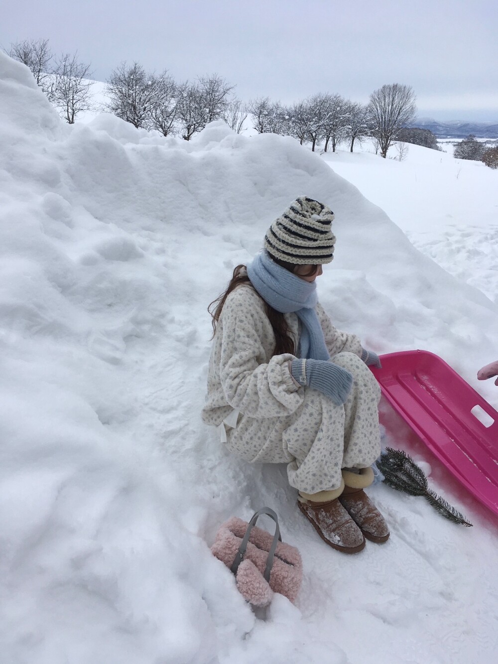 라벤더톤 잔꽃 패턴이 은은하게 들어간, 겨울에 딱 좋은 포근한 보아 소재 조거 팬츠예요.