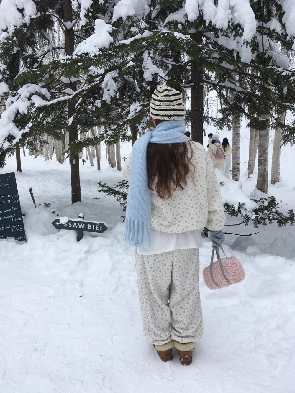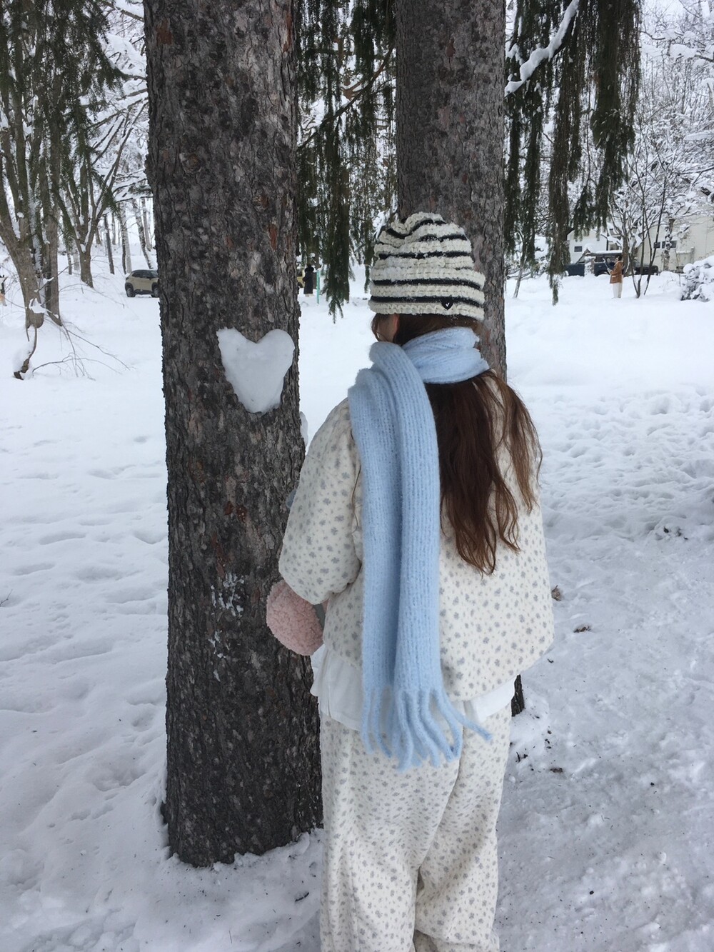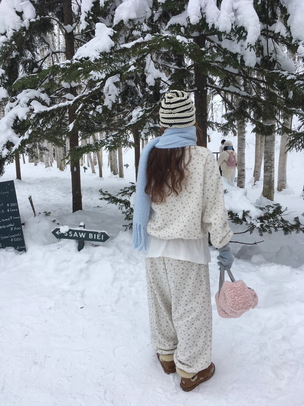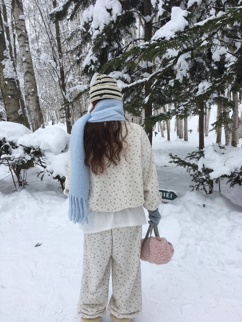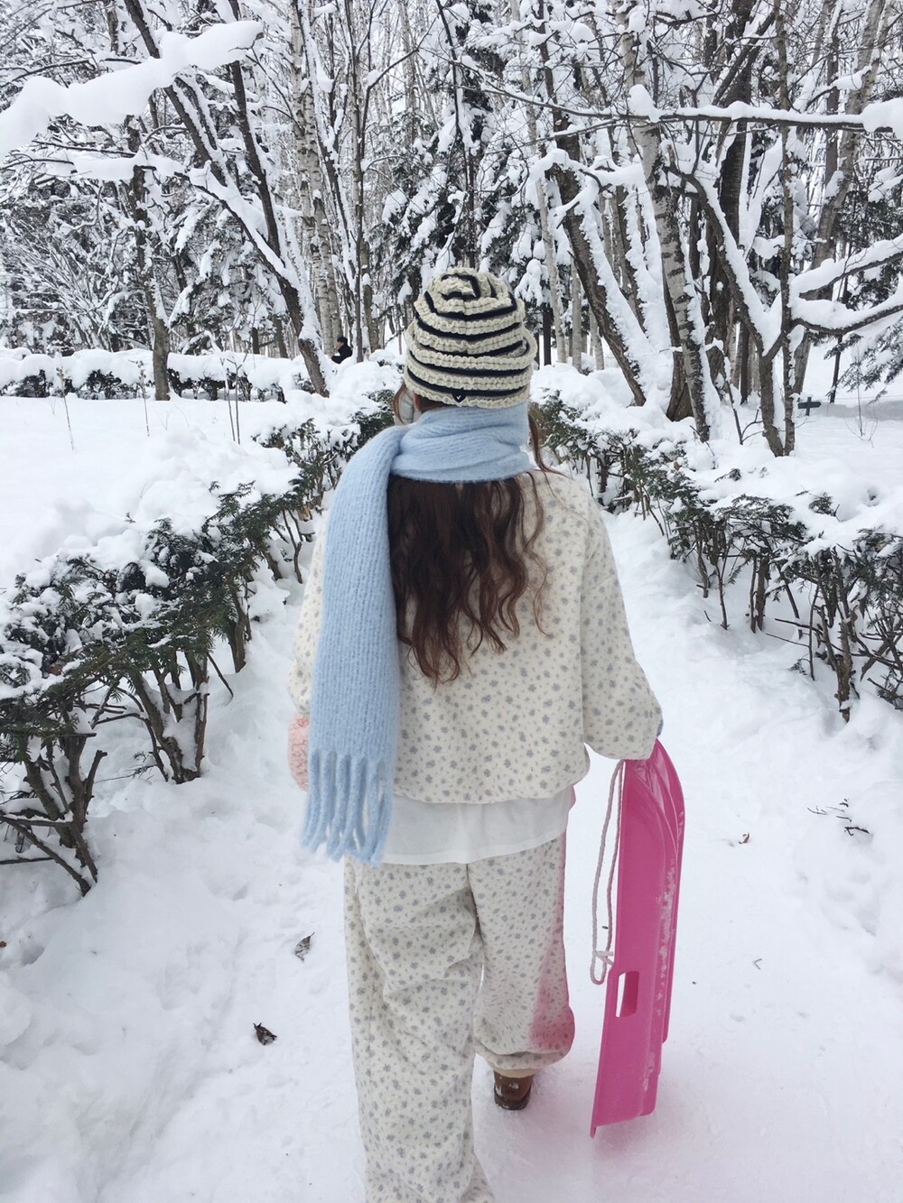 라벤더톤 잔꽃 패턴이 은은하게 들어간, 겨울에 딱 좋은 포근한 보아 소재 조거 팬츠예요.