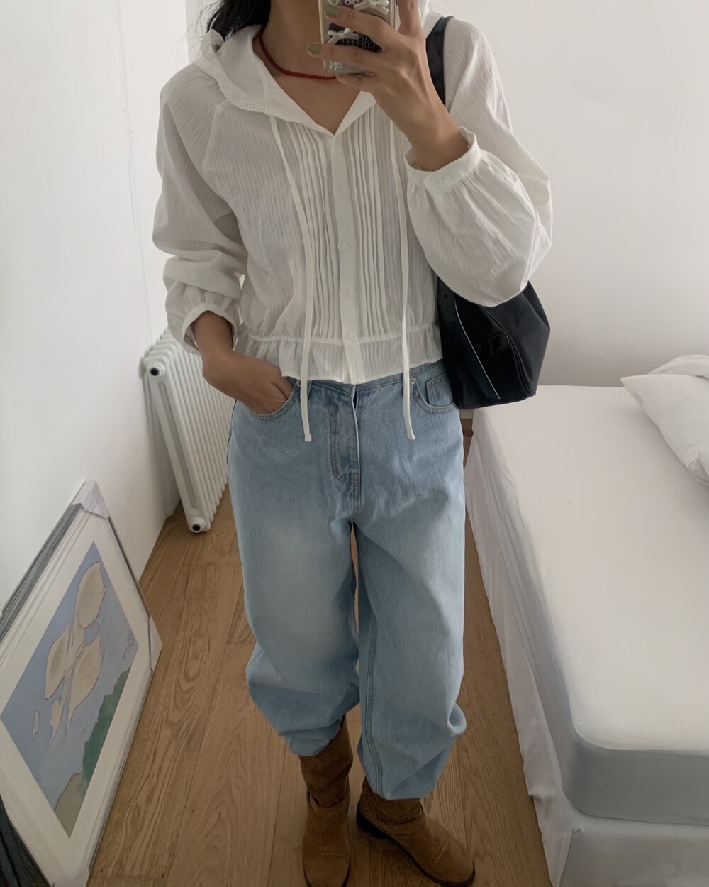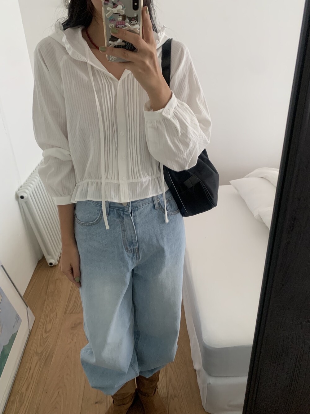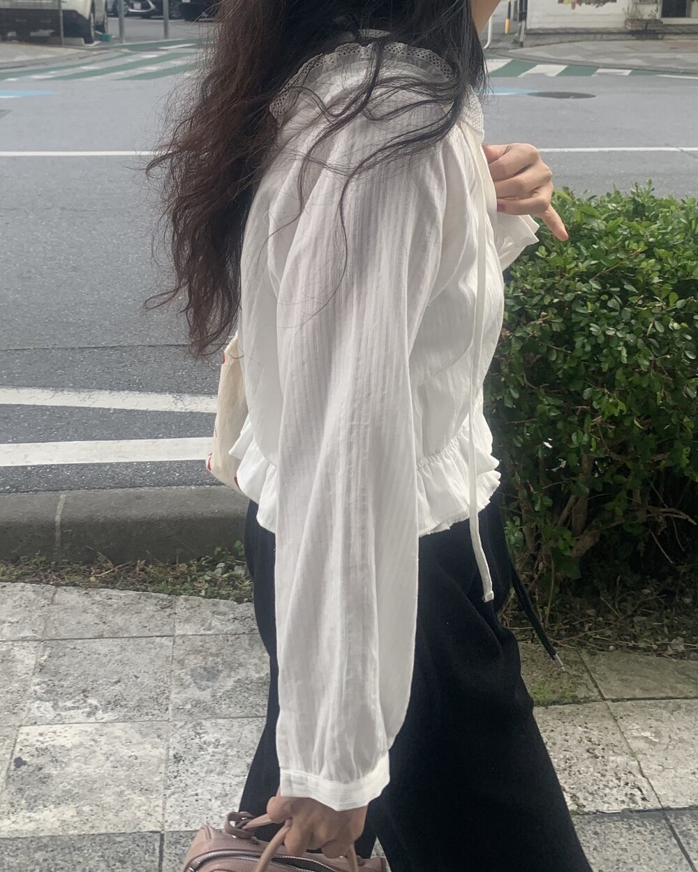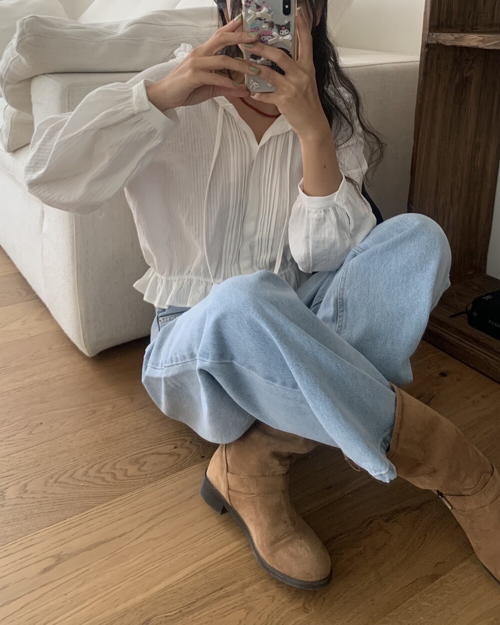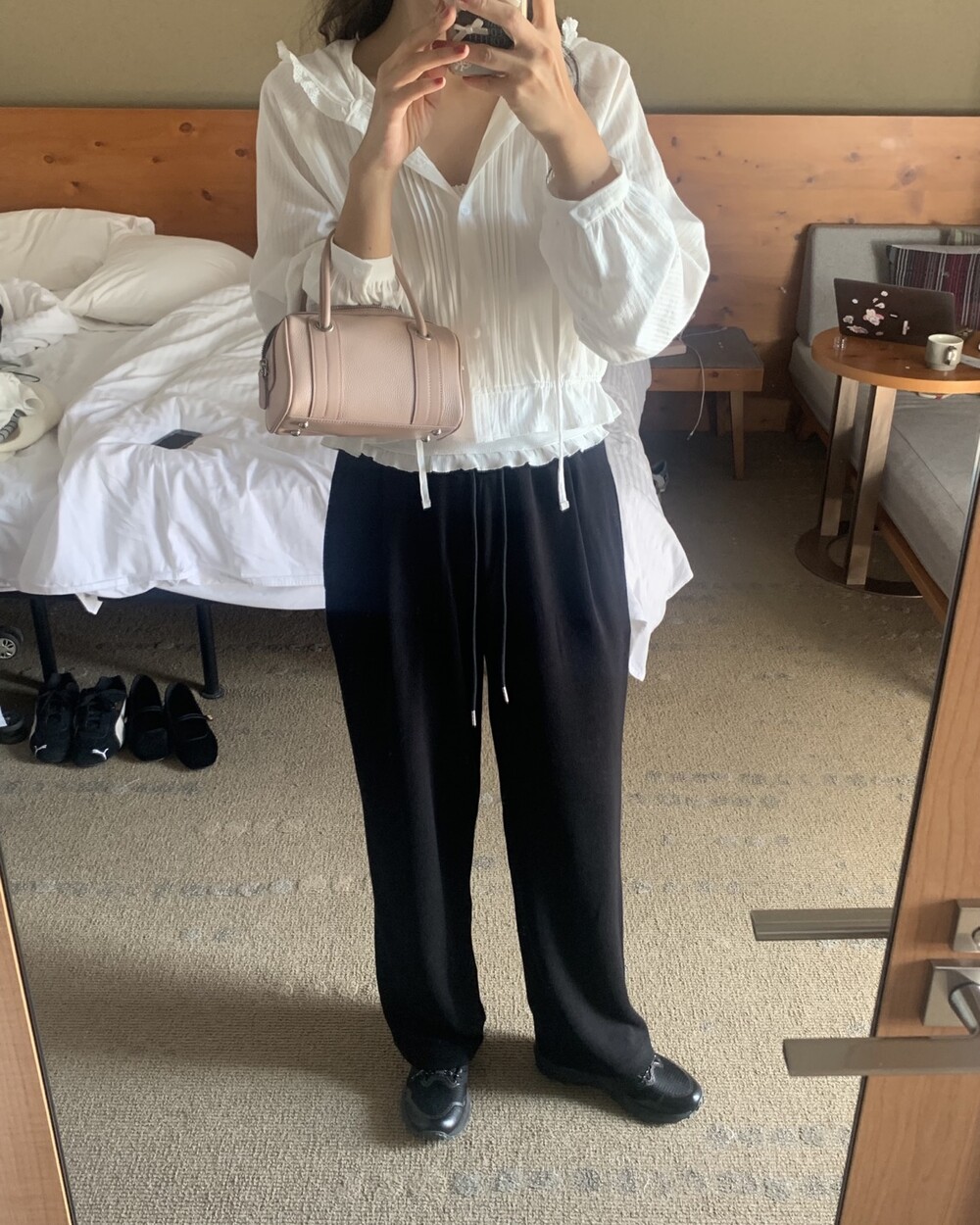 핀턱디테일과 더불어 밑단에 프릴 디테일이 들어가서 러블리한 무드가 돋보인답니다.