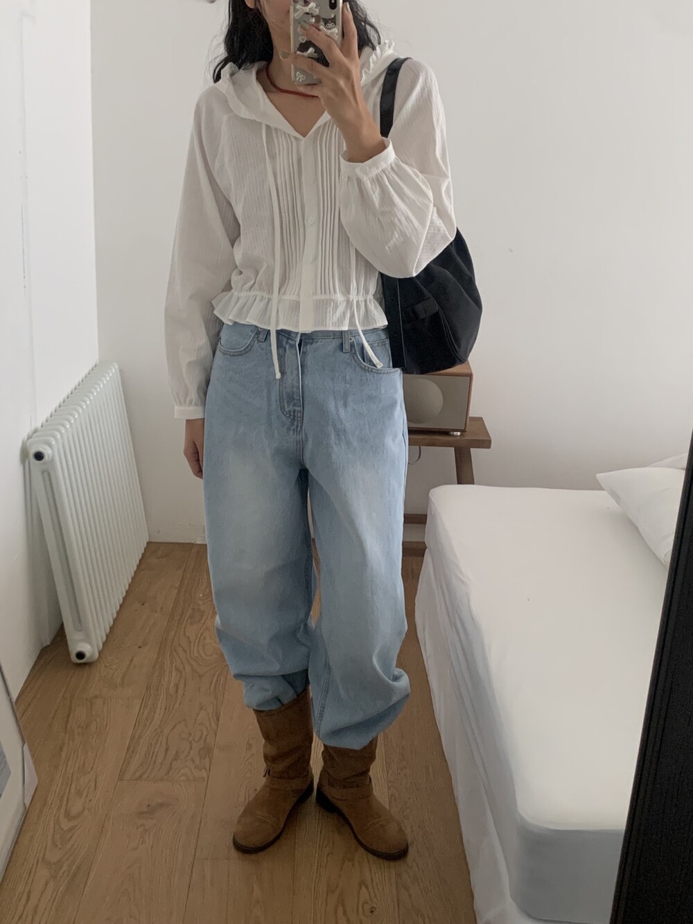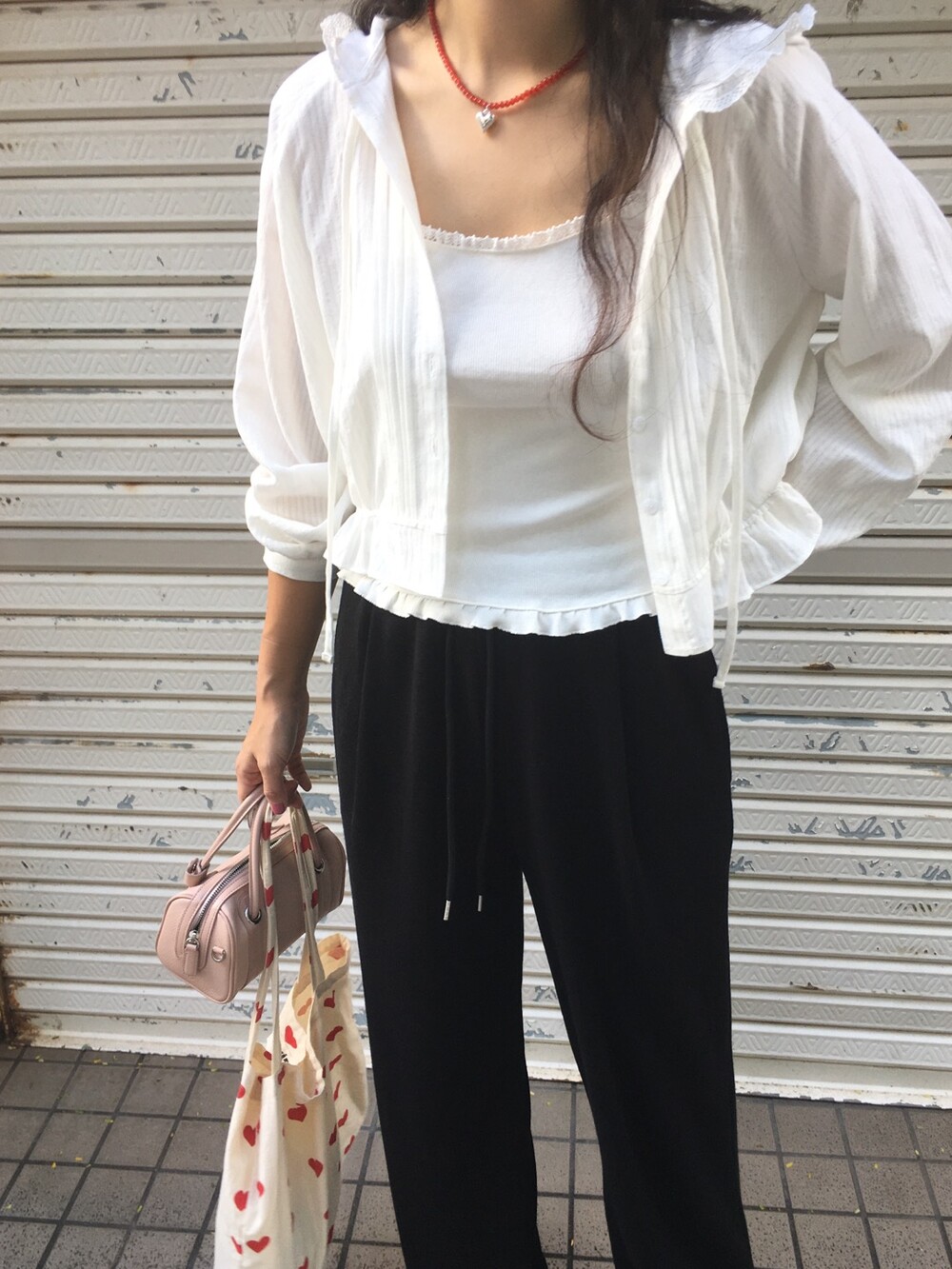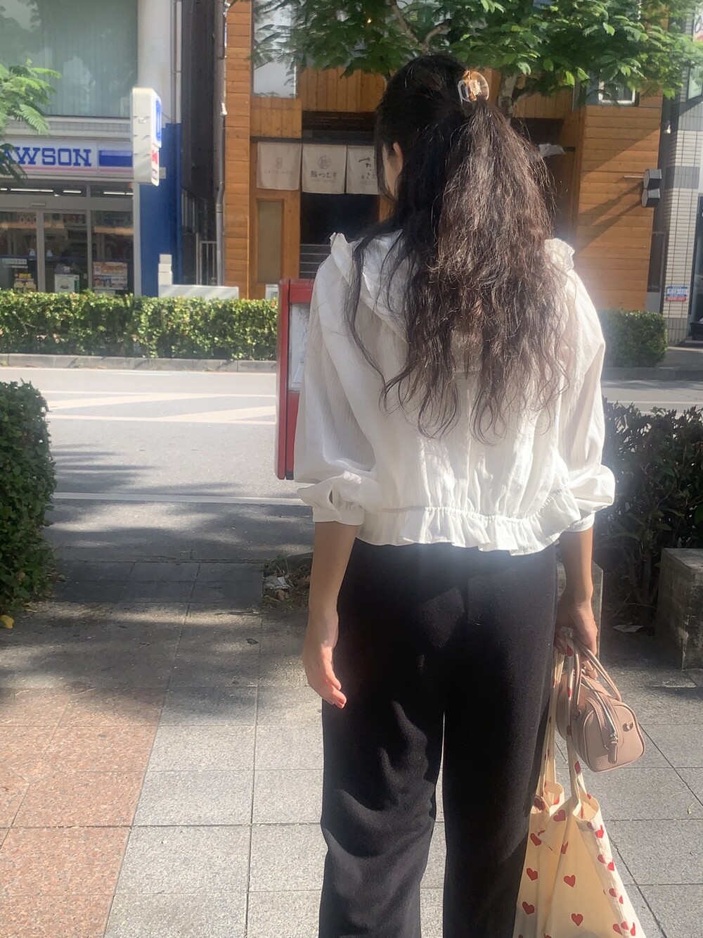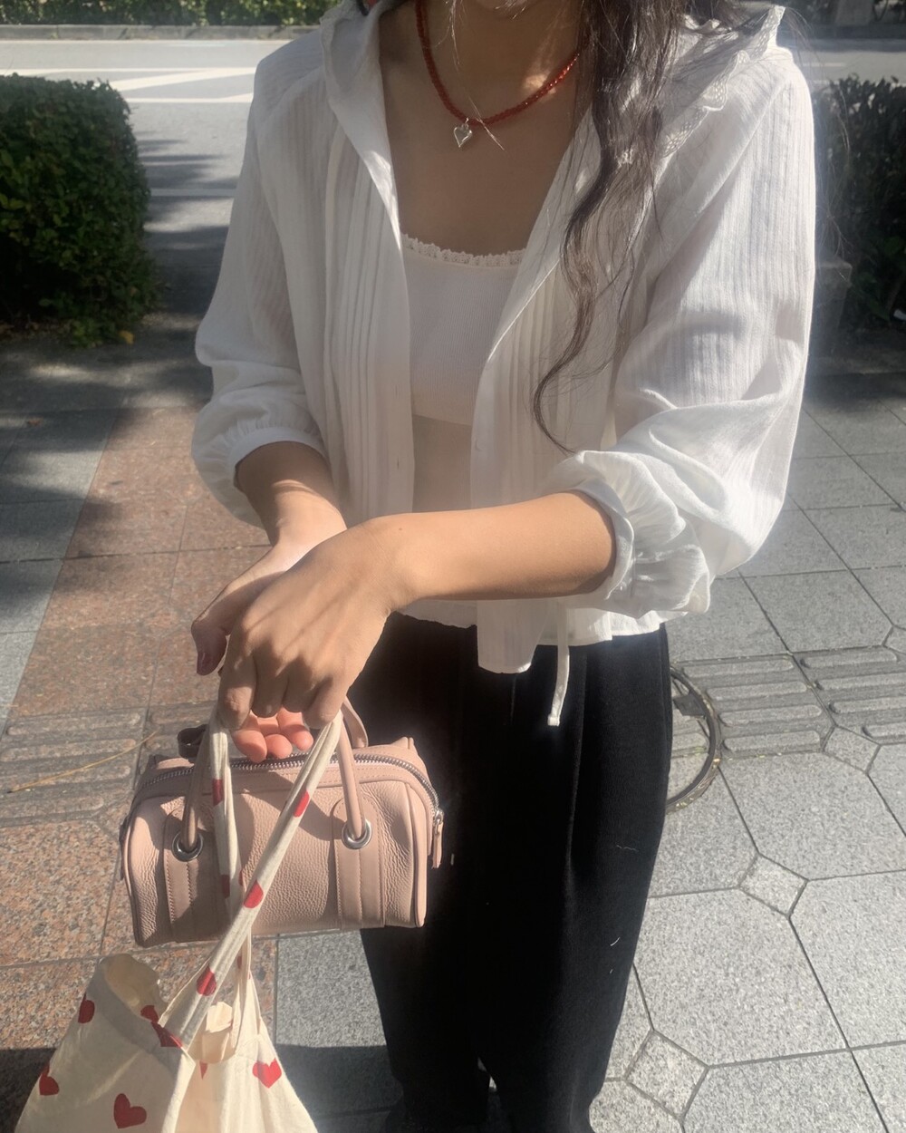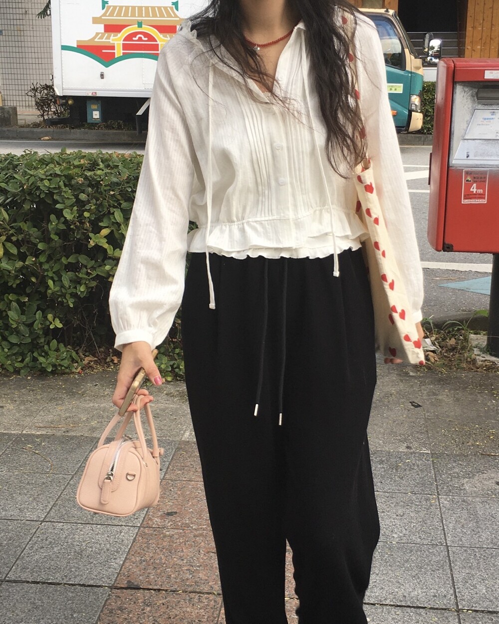 핀턱디테일과 더불어 밑단에 프릴 디테일이 들어가서 러블리한 무드가 돋보인답니다.