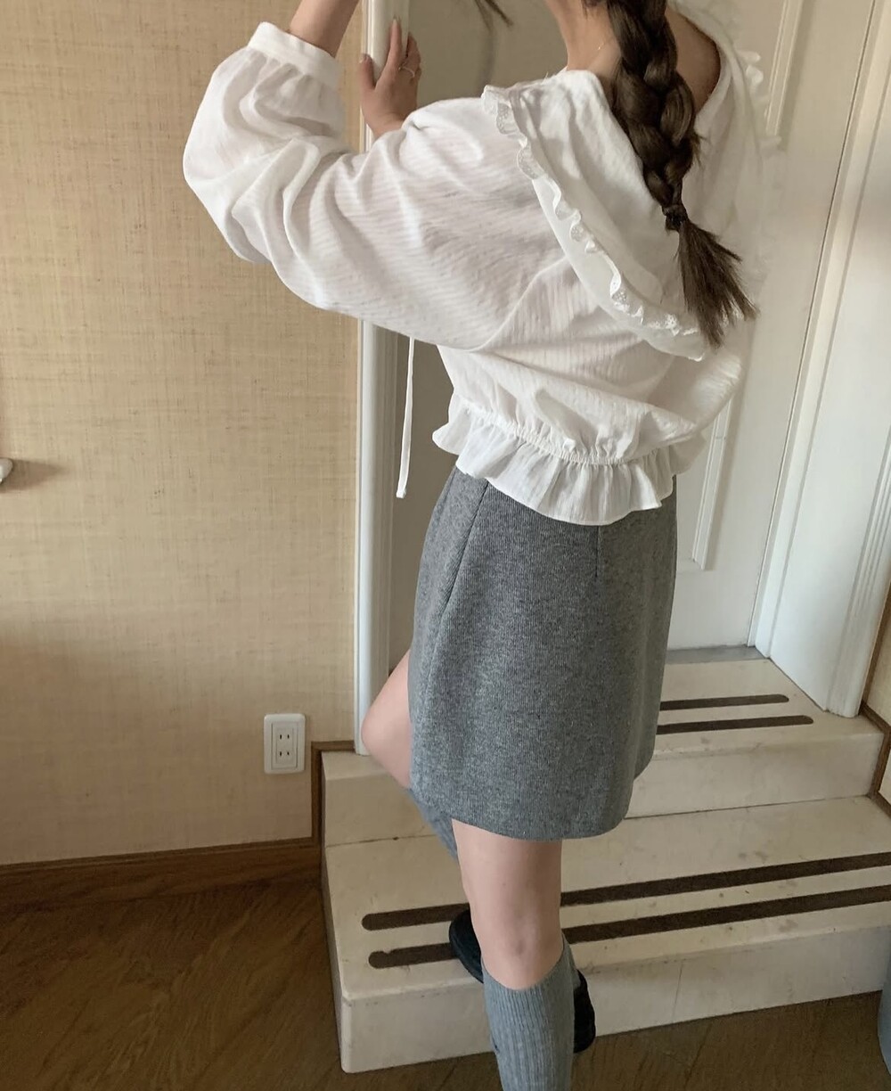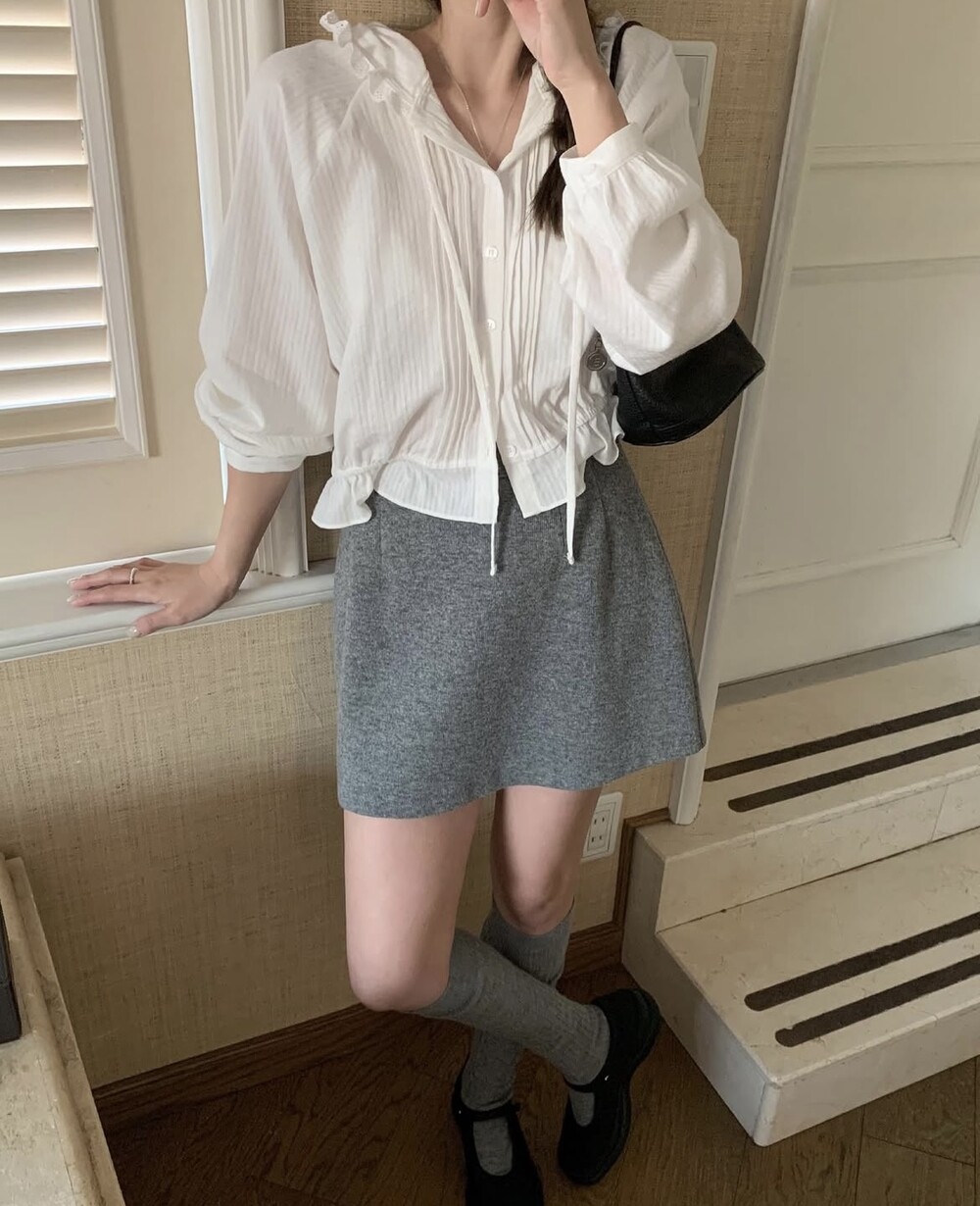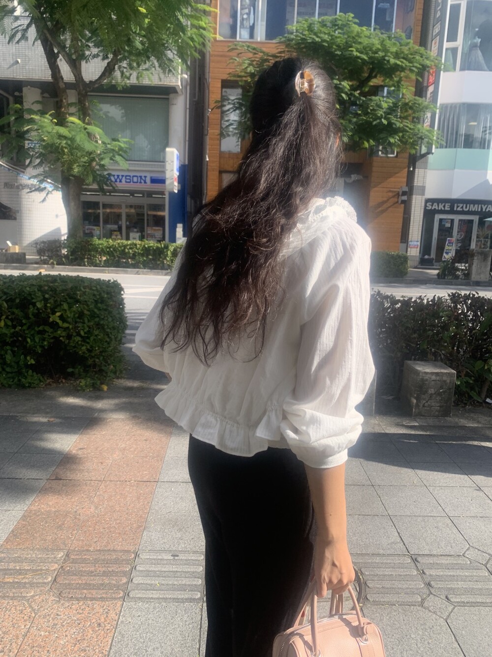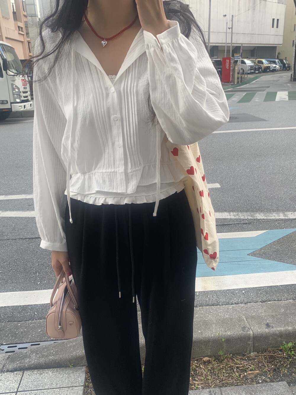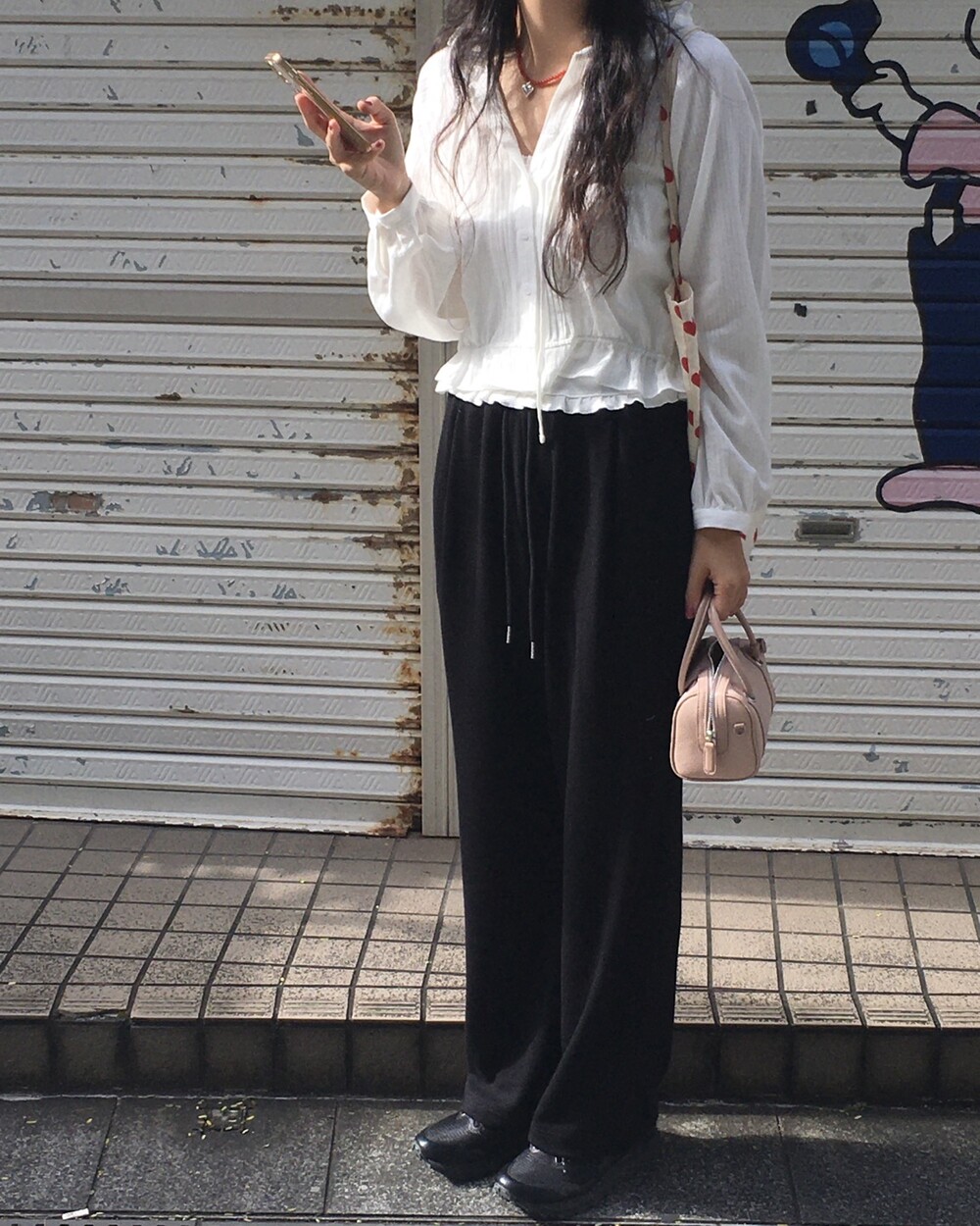 핀턱디테일과 더불어 밑단에 프릴 디테일이 들어가서 러블리한 무드가 돋보인답니다.