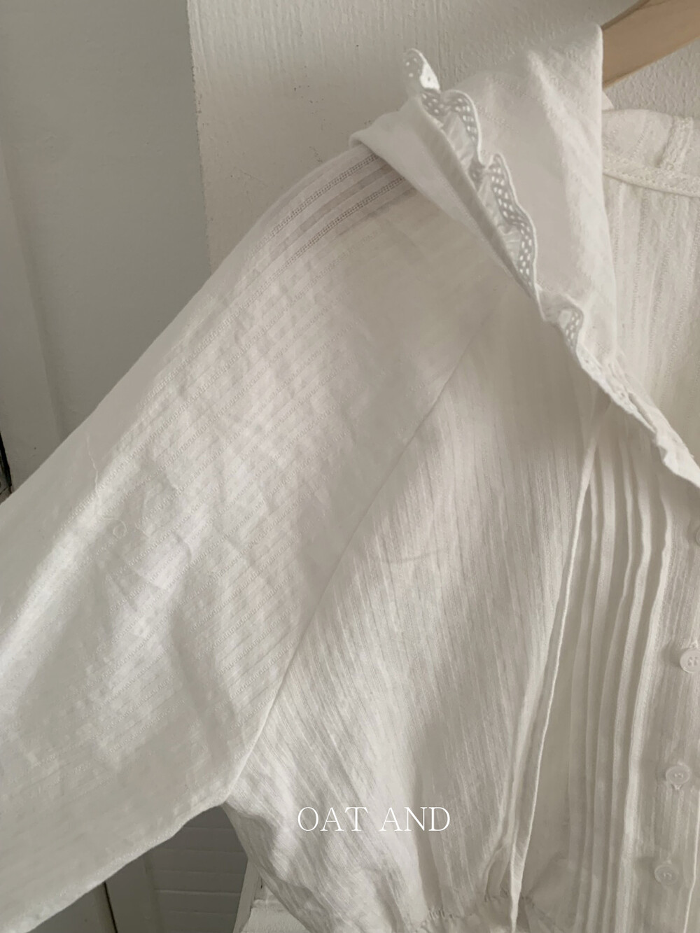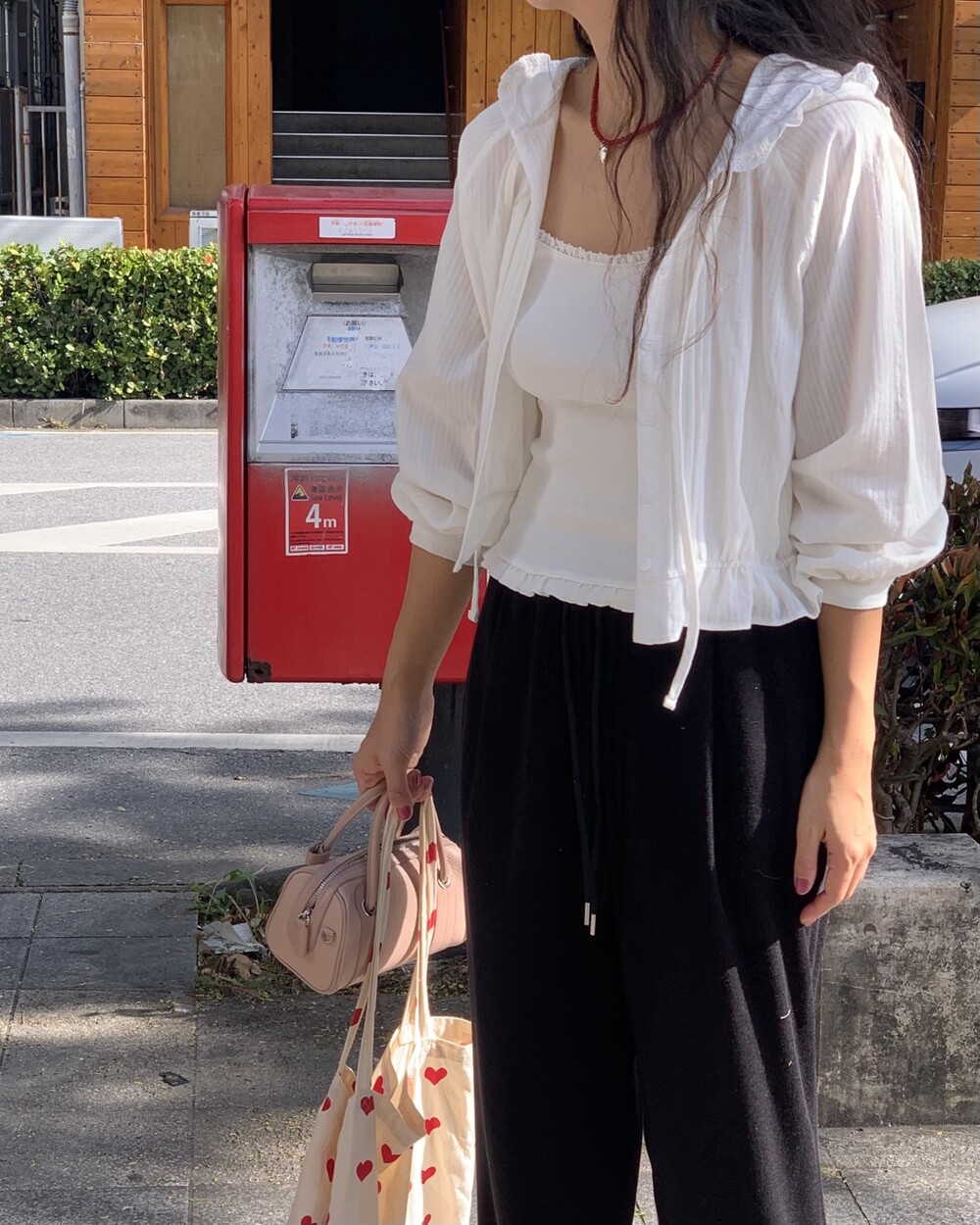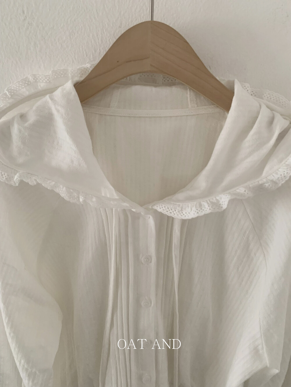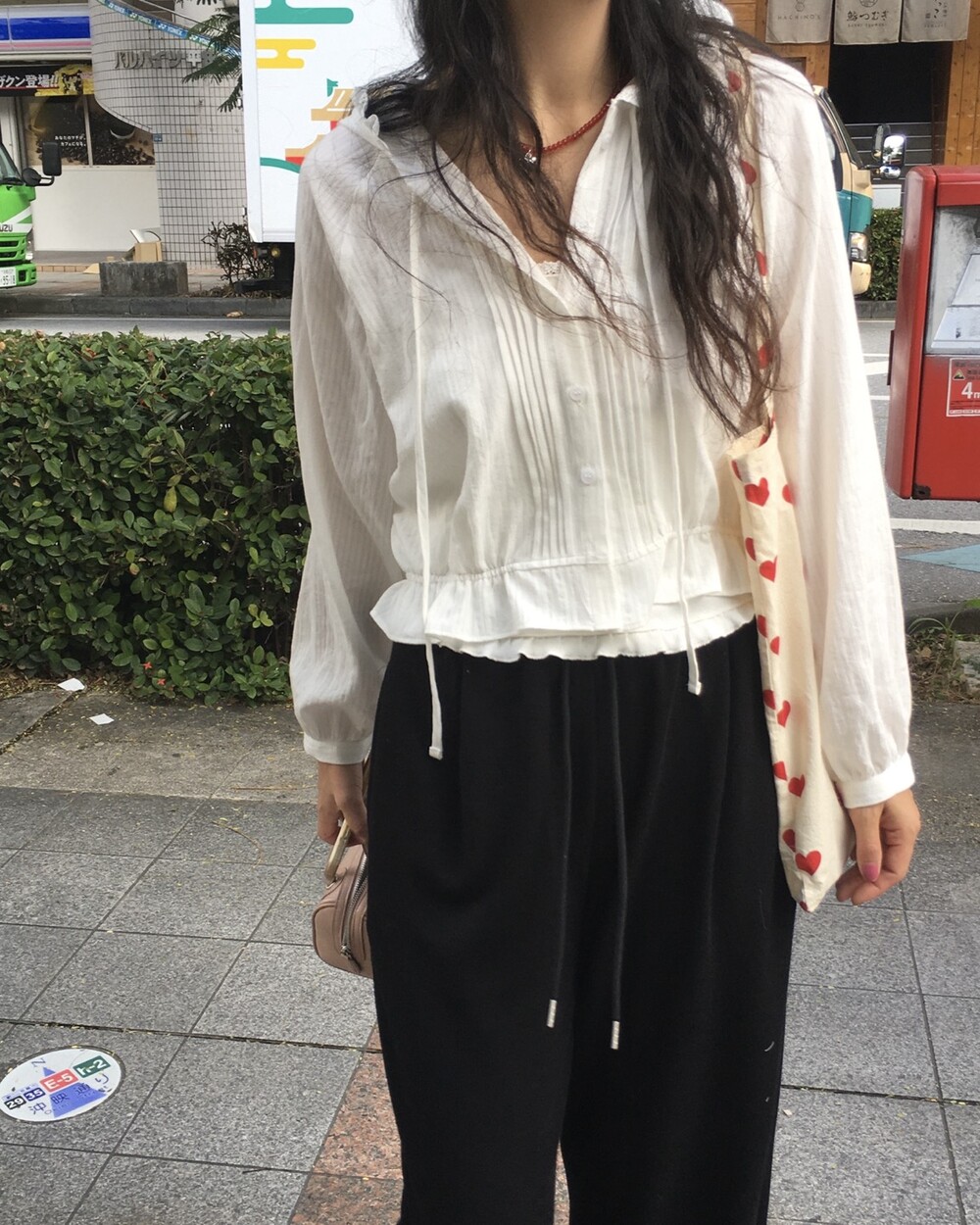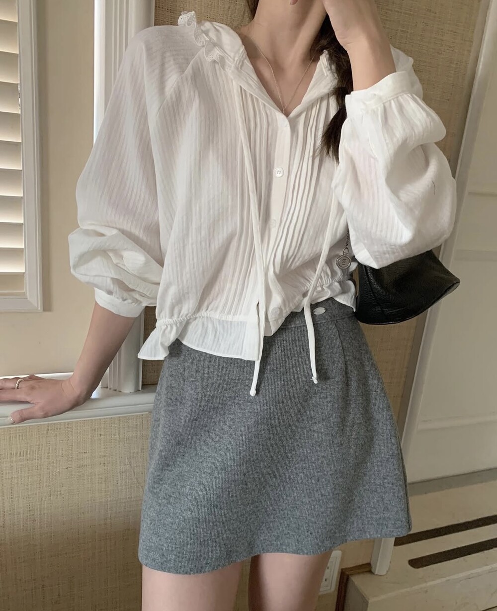 핀턱디테일과 더불어 밑단에 프릴 디테일이 들어가서 러블리한 무드가 돋보인답니다.