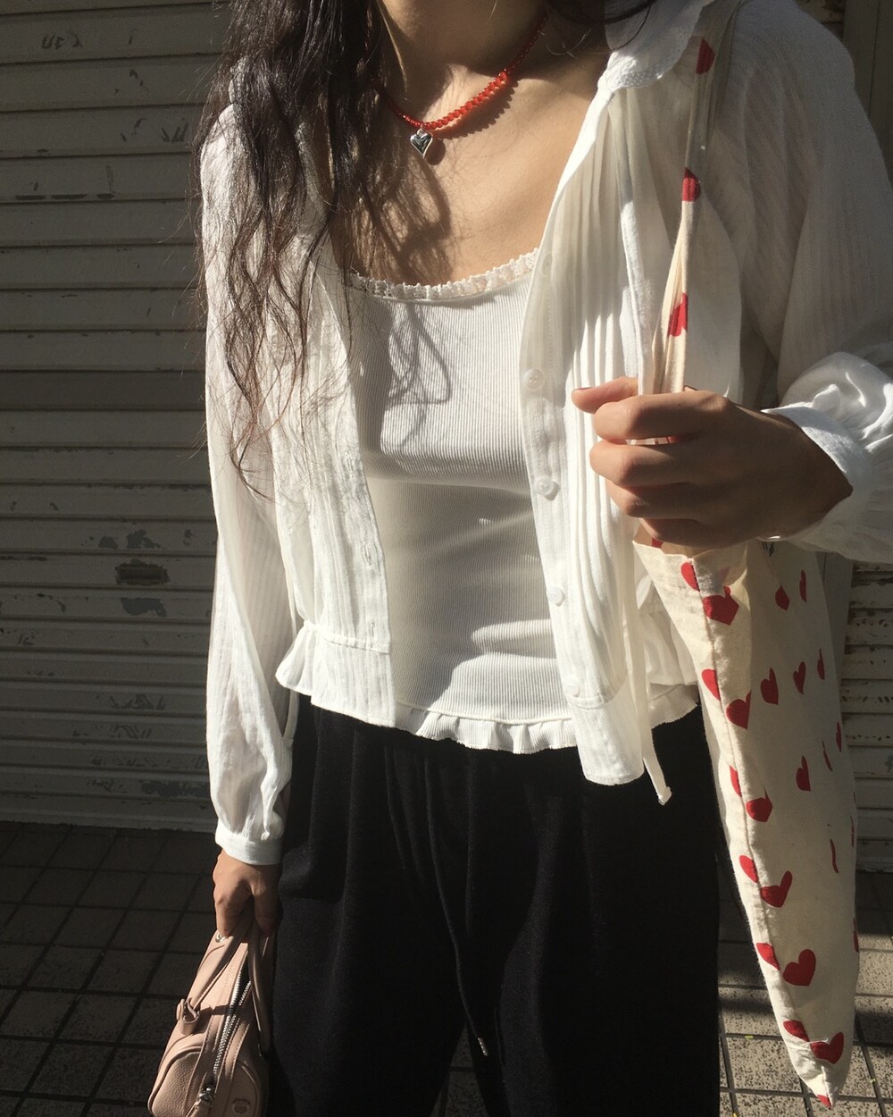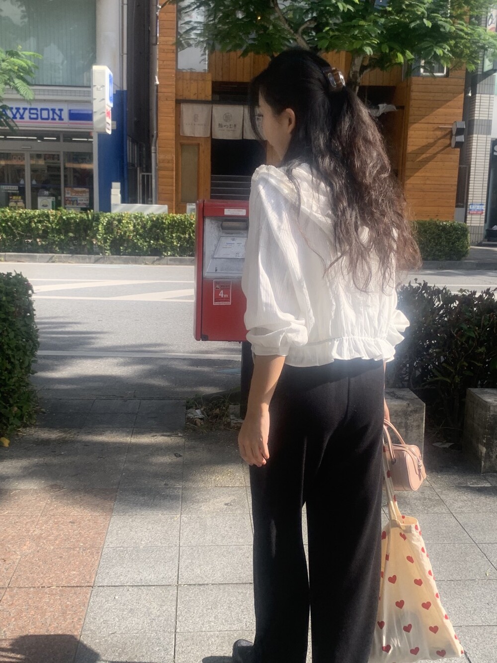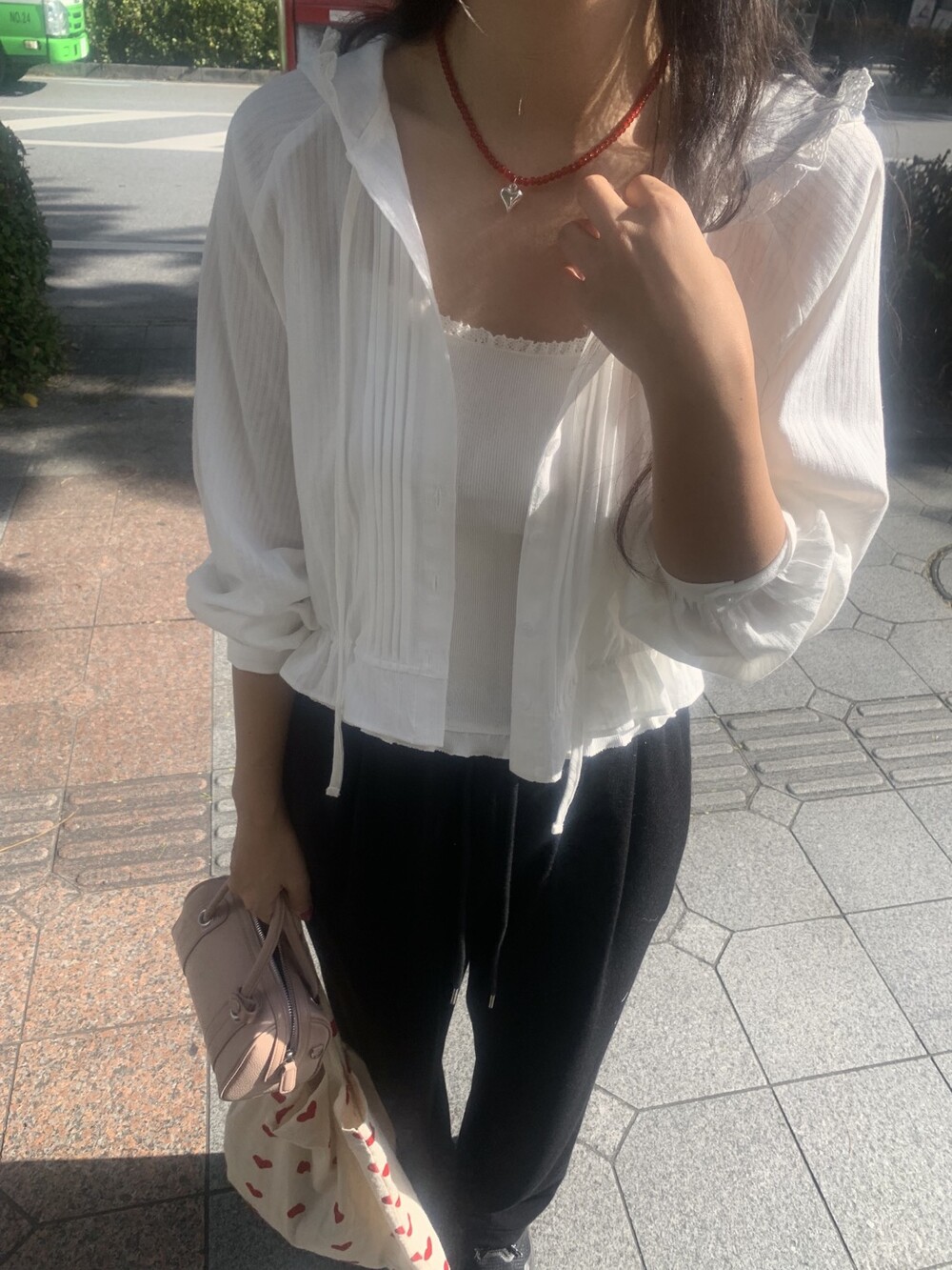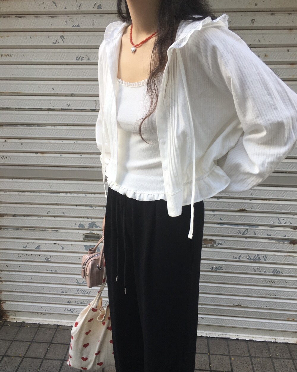 핀턱디테일과 더불어 밑단에 프릴 디테일이 들어가서 러블리한 무드가 돋보인답니다.
