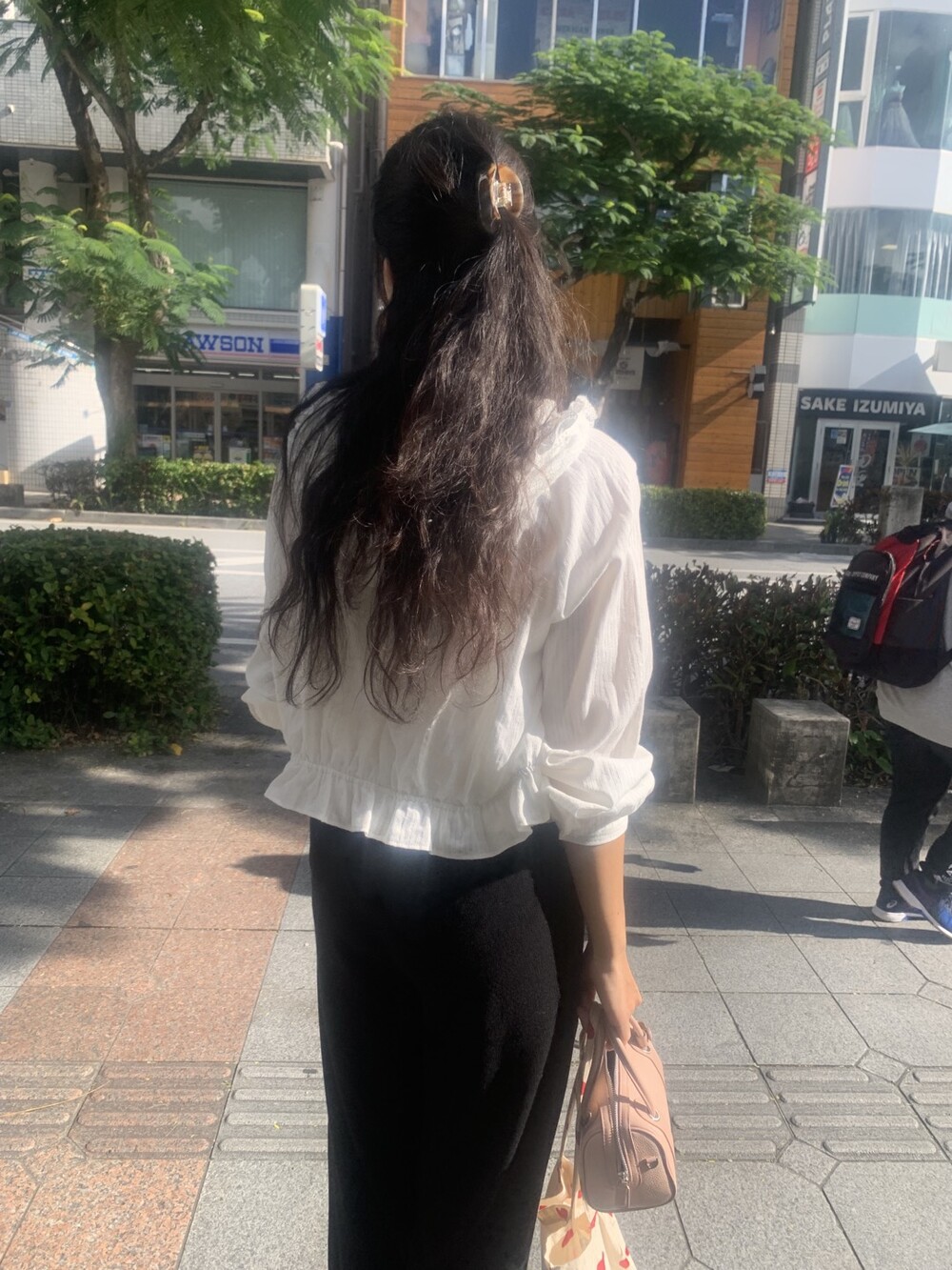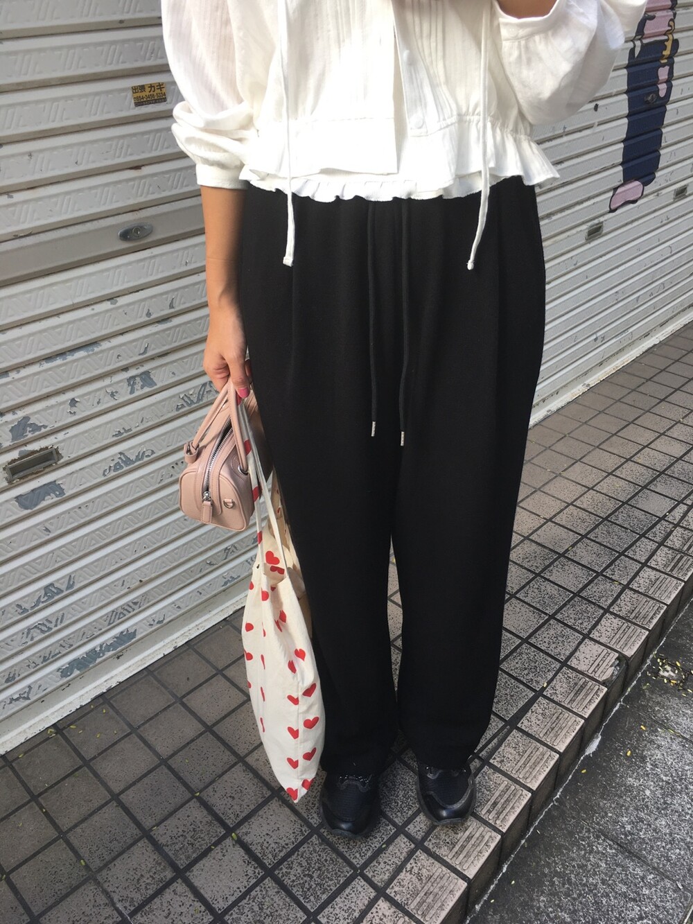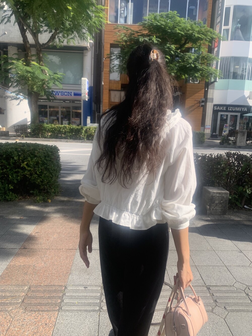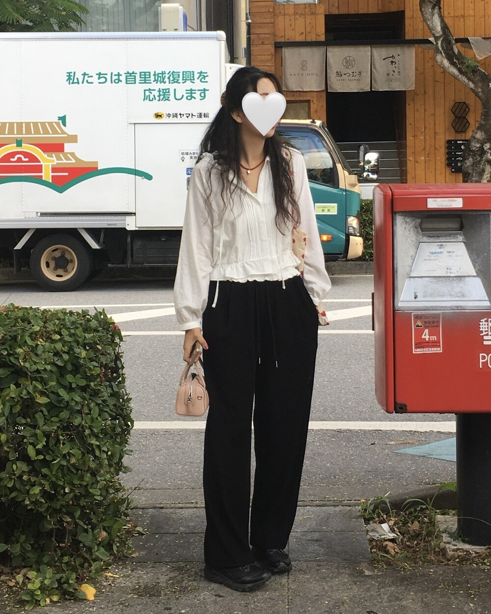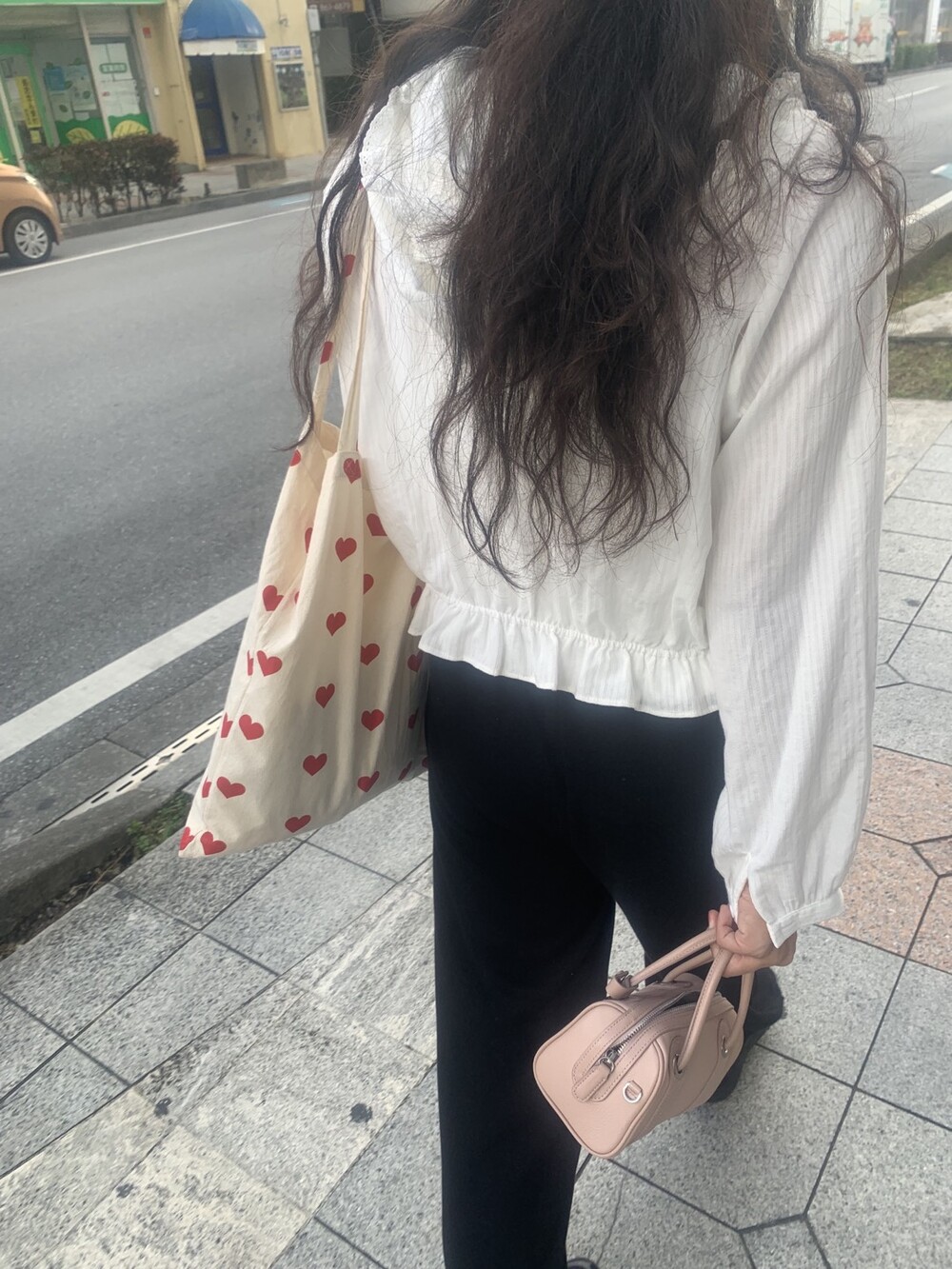 핀턱디테일과 더불어 밑단에 프릴 디테일이 들어가서 러블리한 무드가 돋보인답니다.