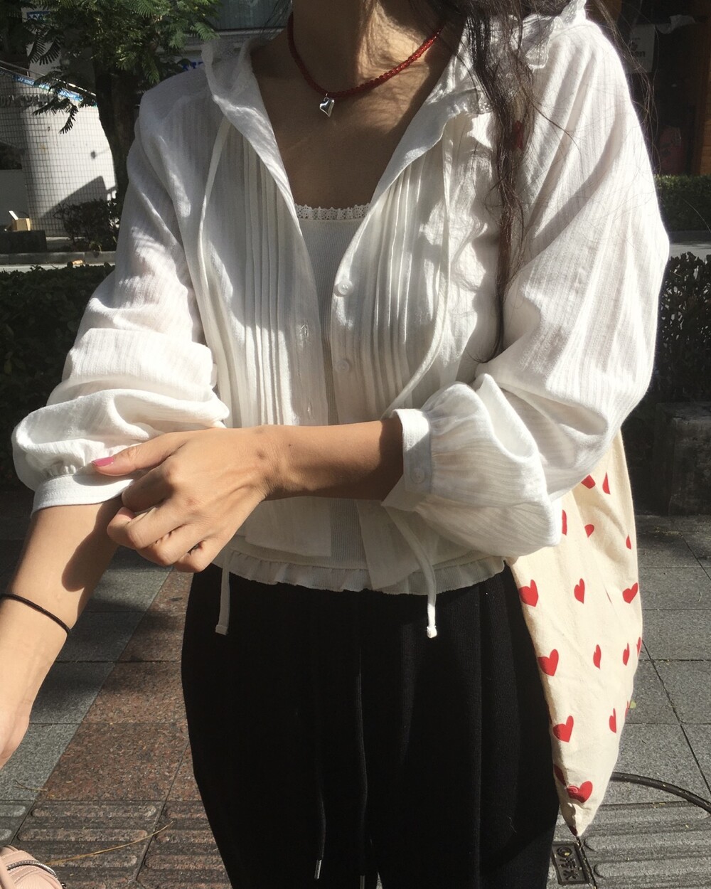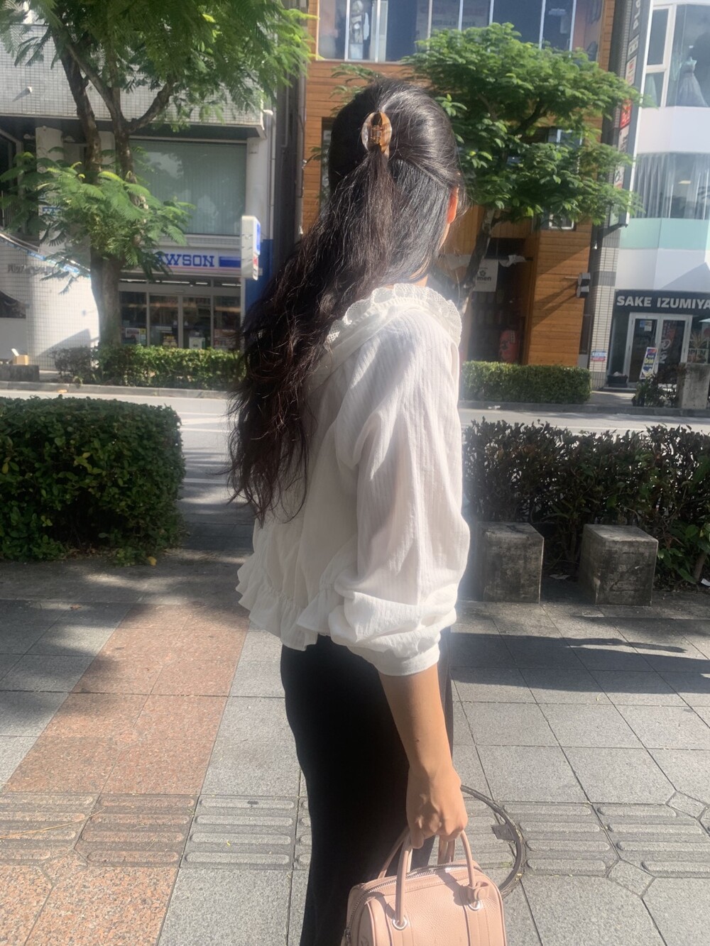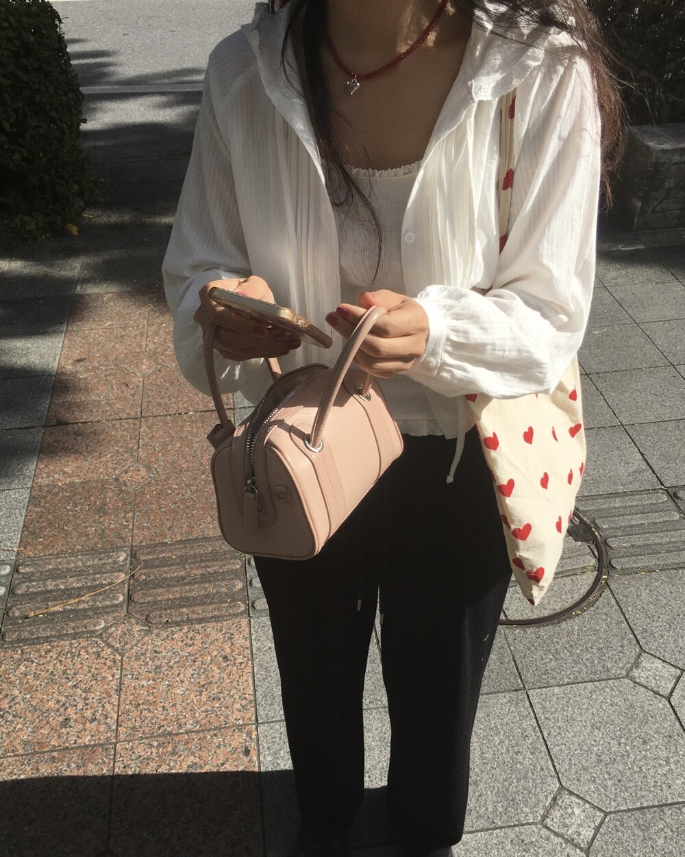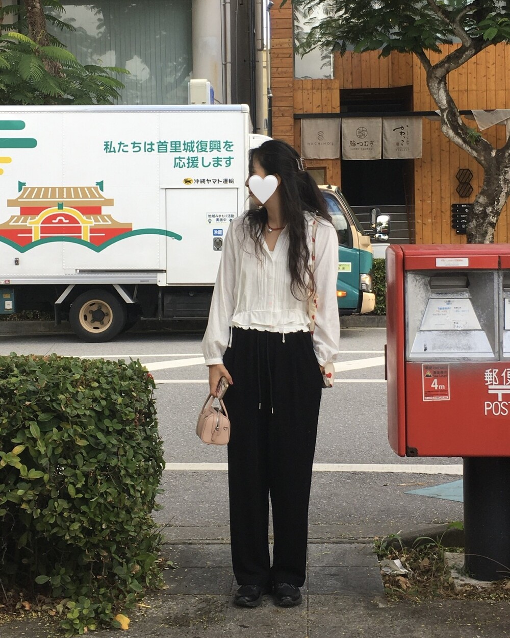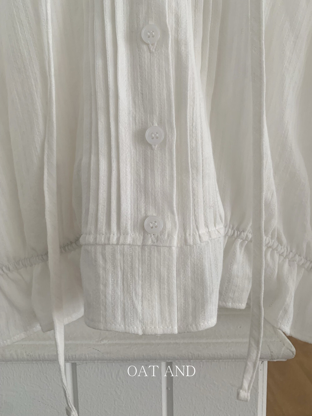 핀턱디테일과 더불어 밑단에 프릴 디테일이 들어가서 러블리한 무드가 돋보인답니다.