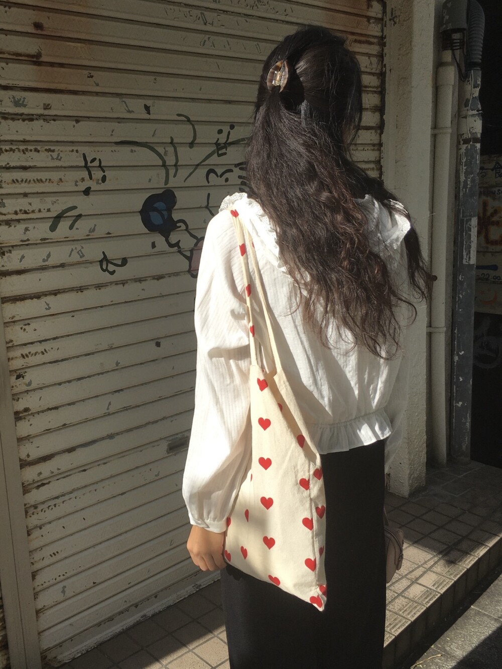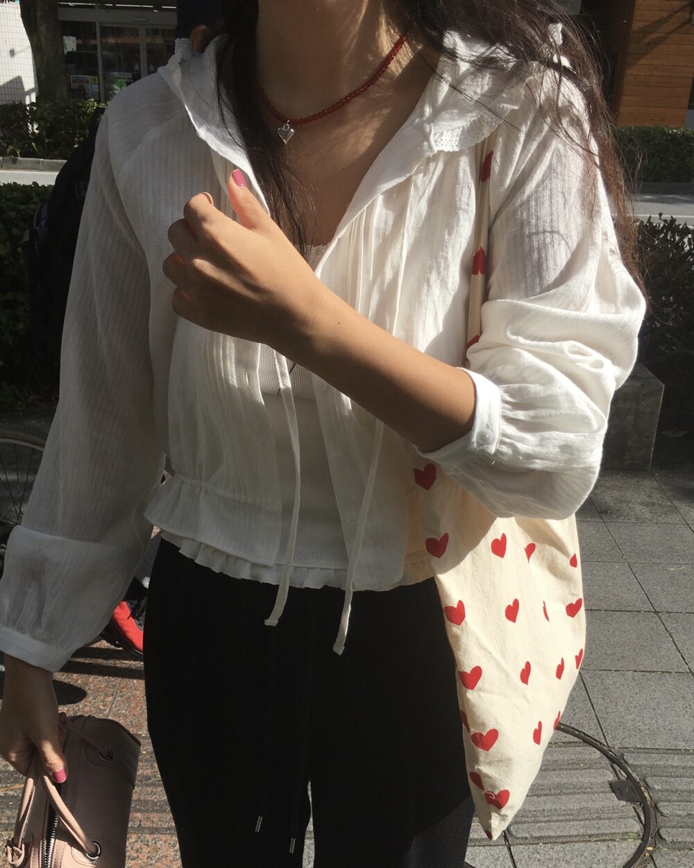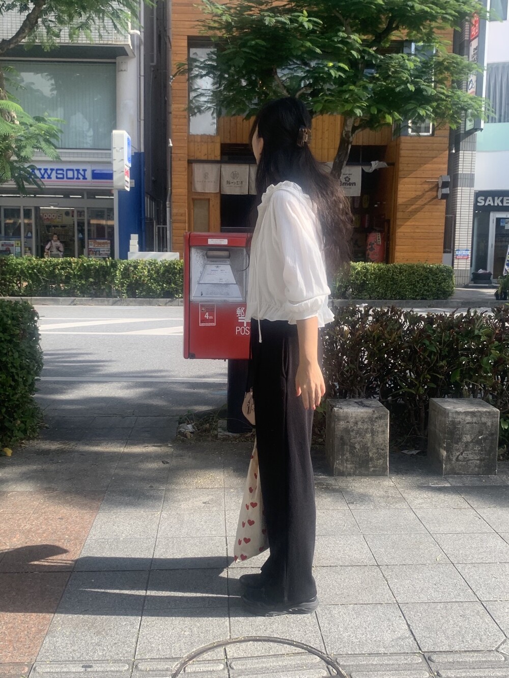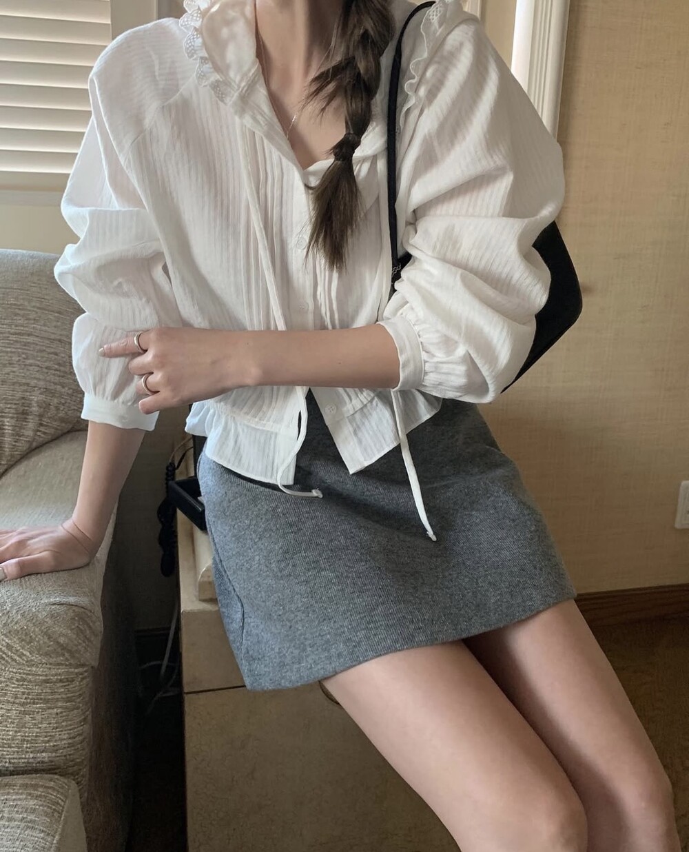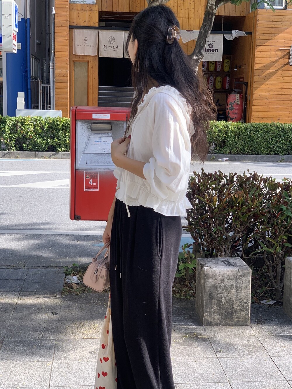 핀턱디테일과 더불어 밑단에 프릴 디테일이 들어가서 러블리한 무드가 돋보인답니다.