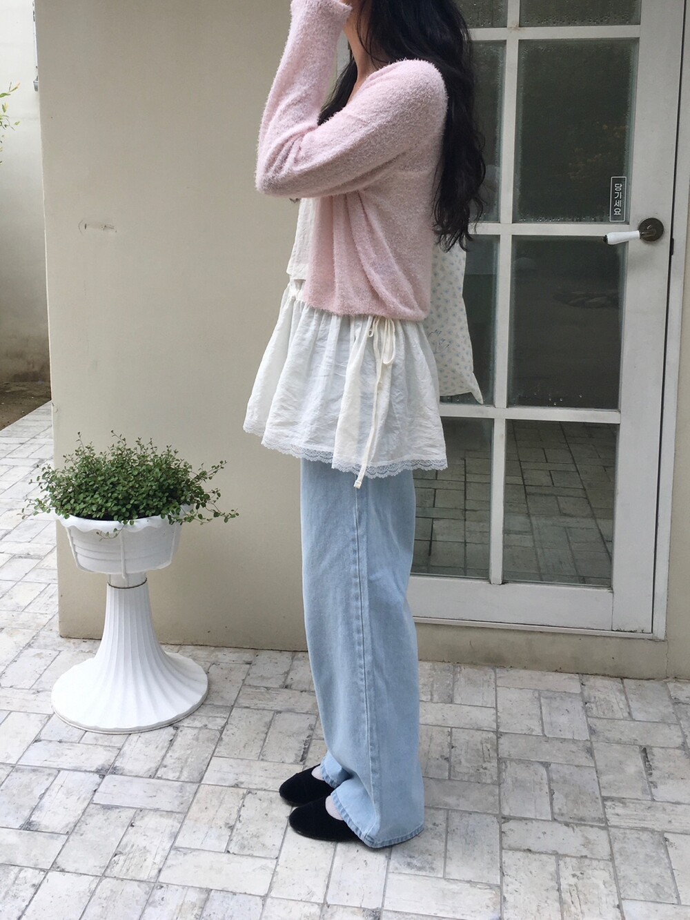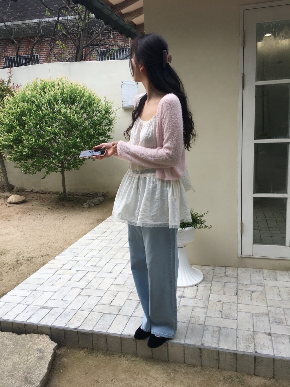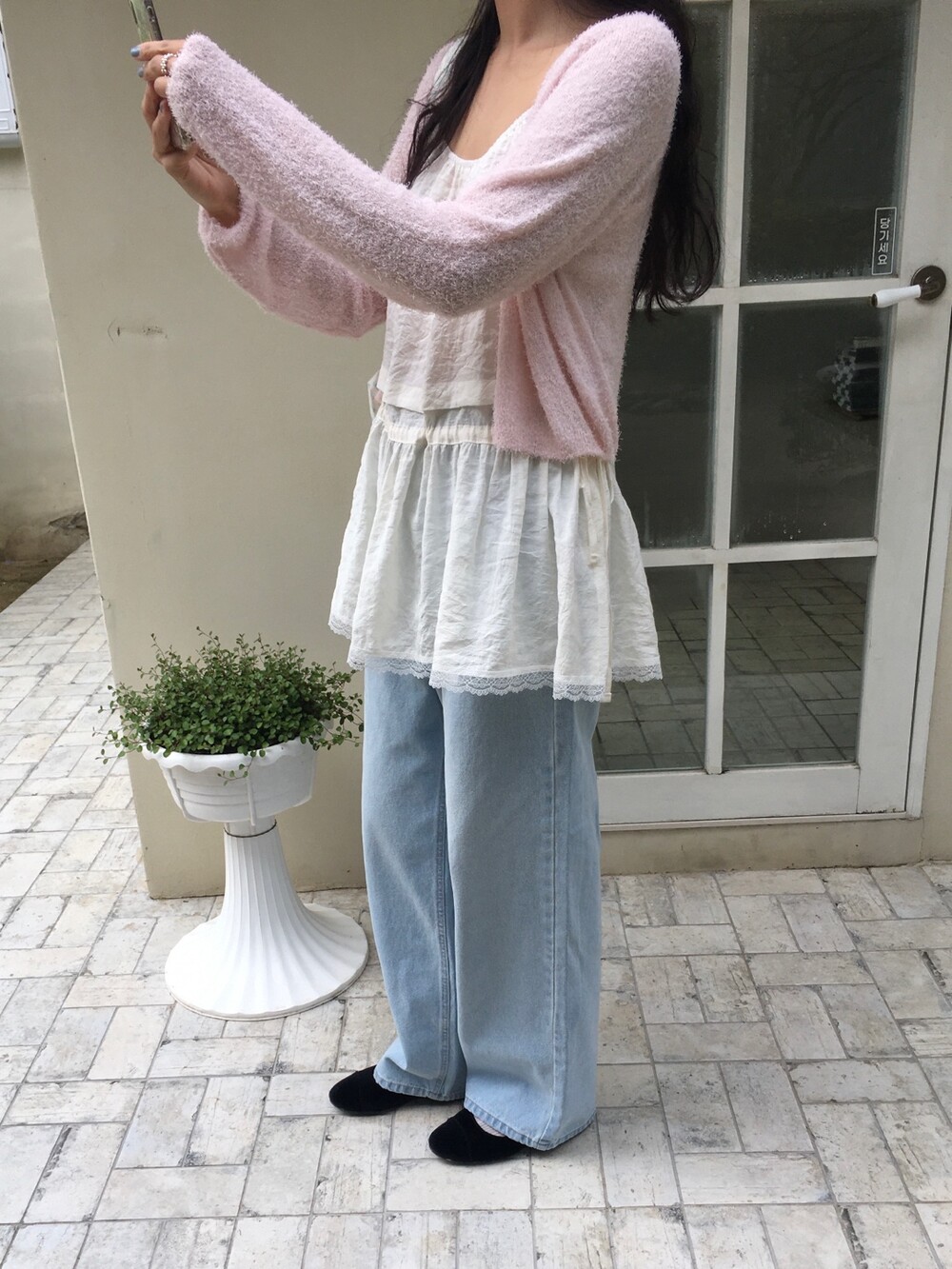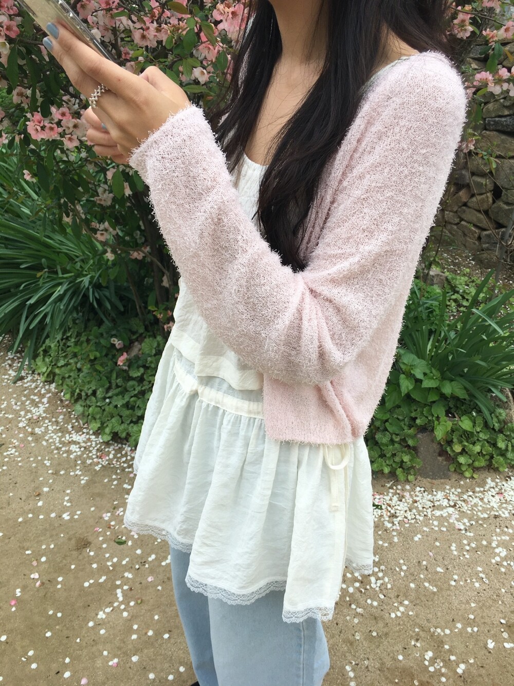 가볍게 걸치기만 해도 여리여리한 분위기를 완성해주는 아이템입니다. 어떤 룩에도 부드럽고 내추럴하게 어우러져 활용도가 높아요.브이넥 라인으로 목선을 길어 보이게 연출해주며, 프론트 버튼 디테일로 오픈/클로징에 따라 다양한 스타일링이 가능합니다. 바디를 따라 자연스럽게 흐르는 슬림한 핏감이 여성스러운 실루엣을 살려주고, 롱 슬리브 디자인이 더욱 여릿한 무드를 더해줍니다.