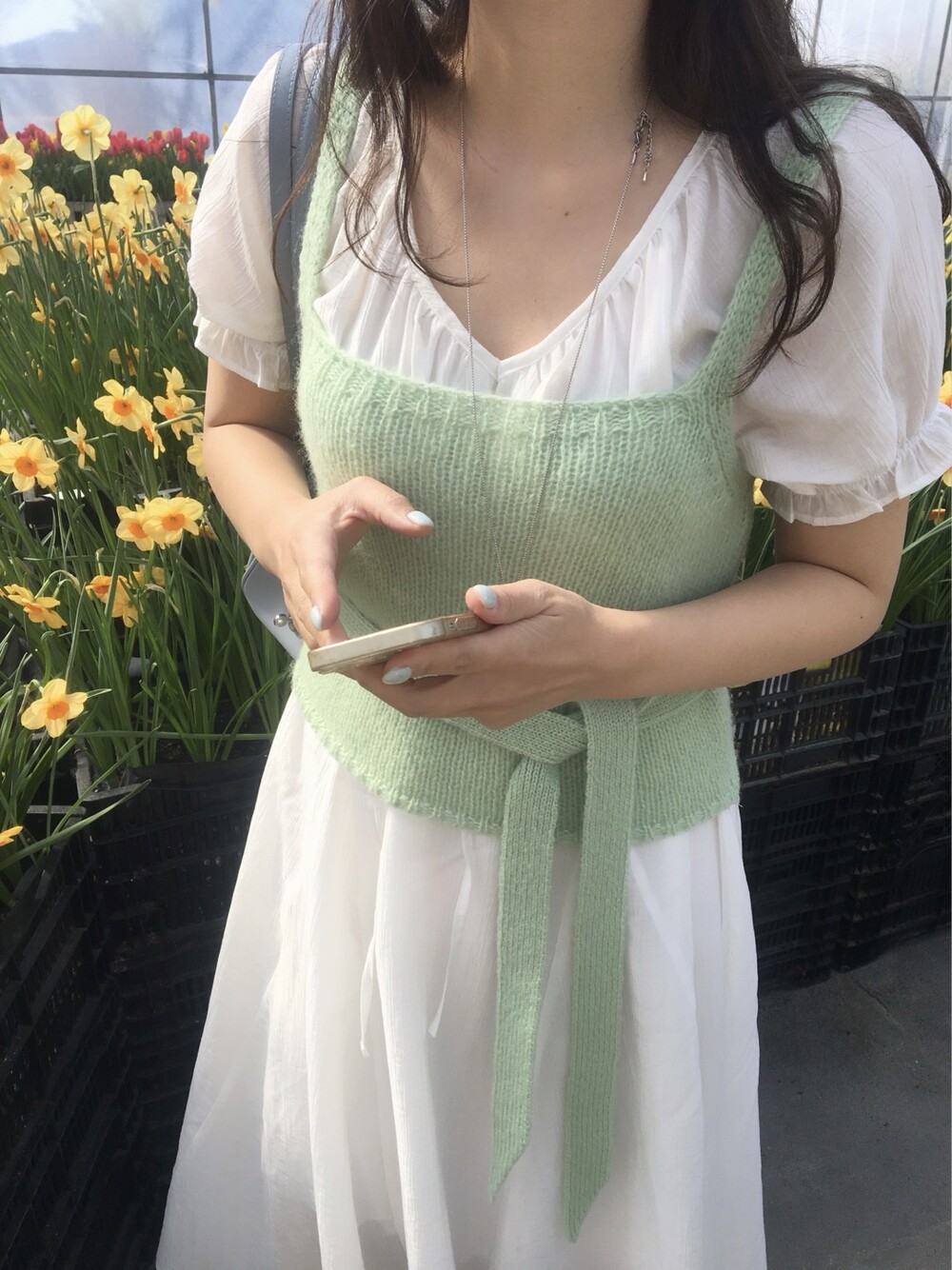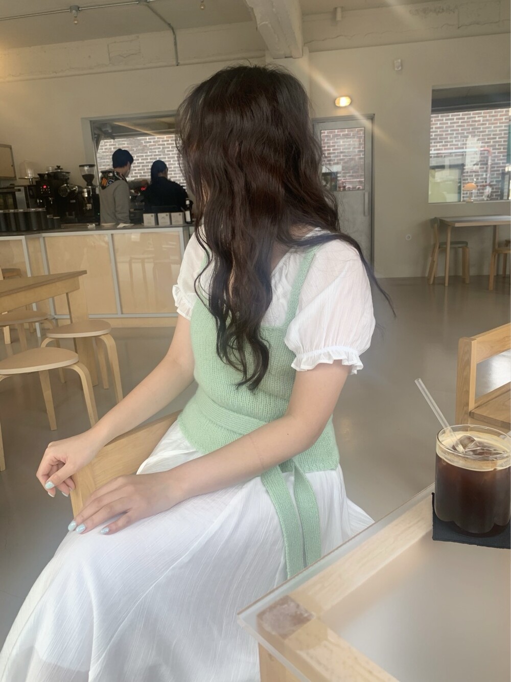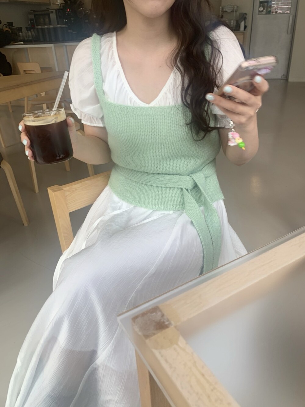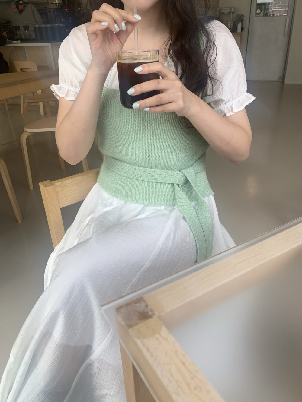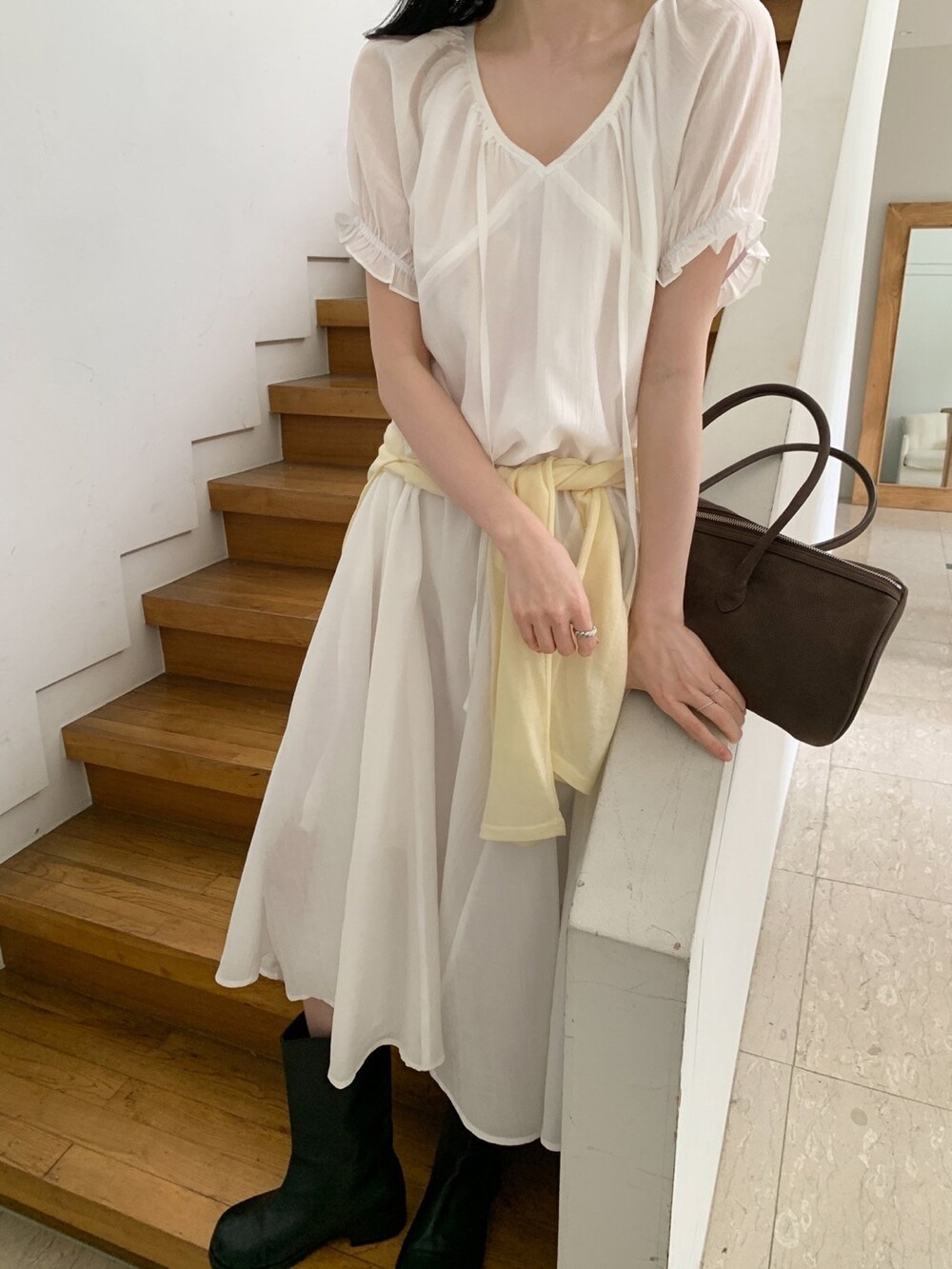 넥라인은 브이넥으로 디자인되어 답답함 없이 목선을 길어 보이게 만들어주고,앞부분에 더해진 스트링 디테일이 은은한 포인트가 되어줘요.