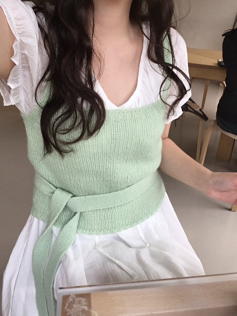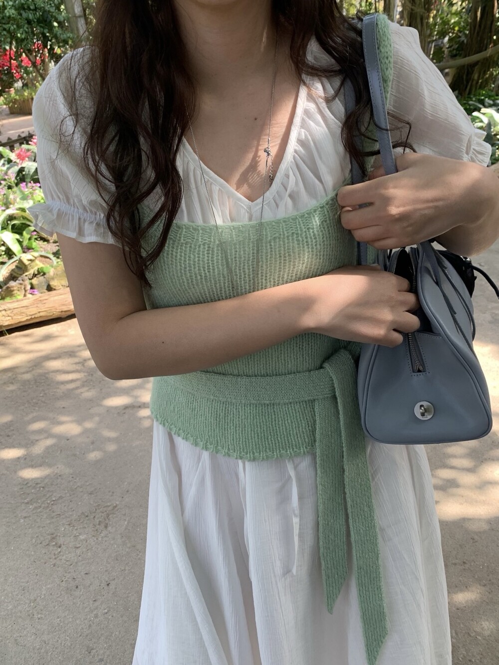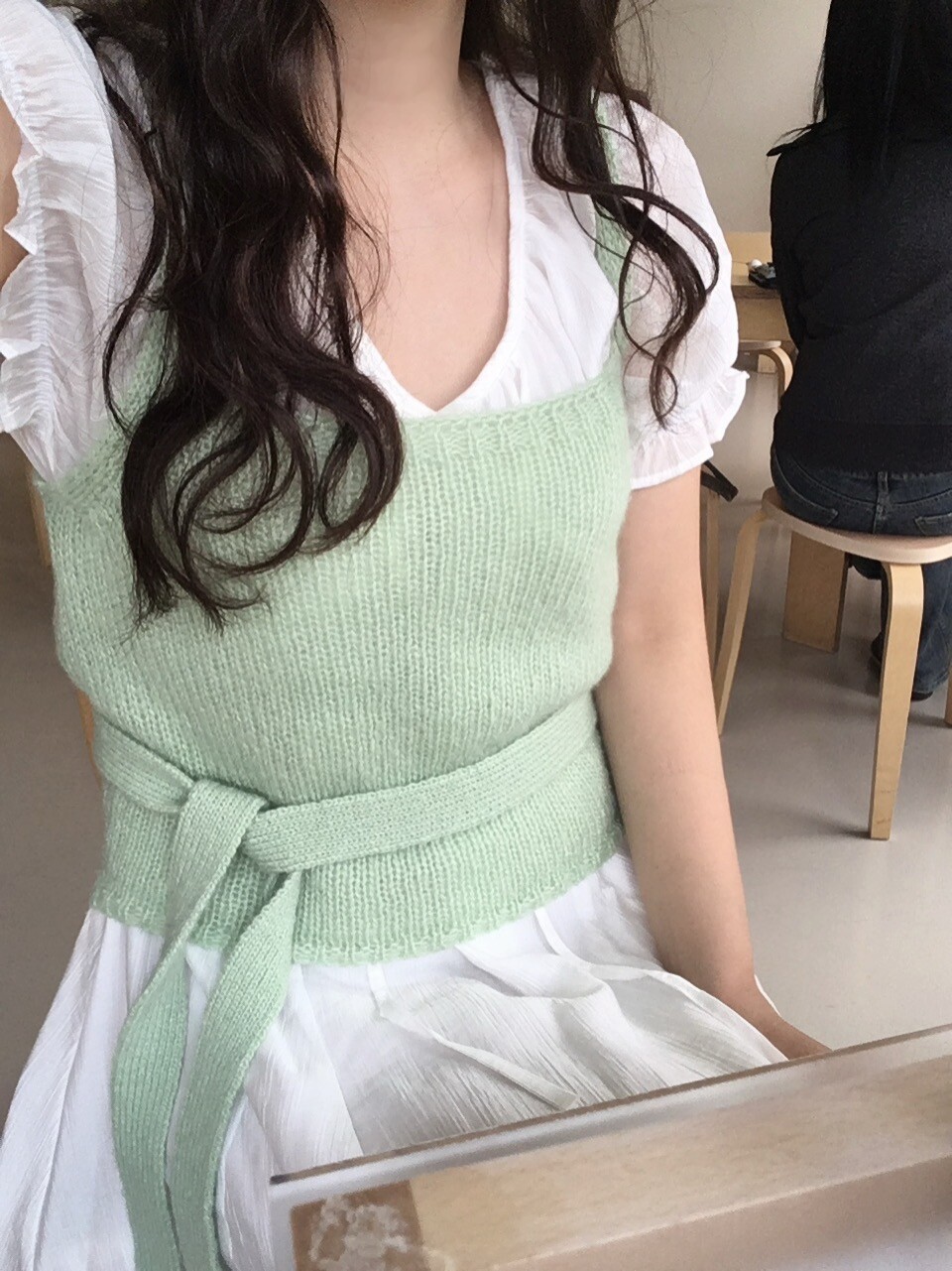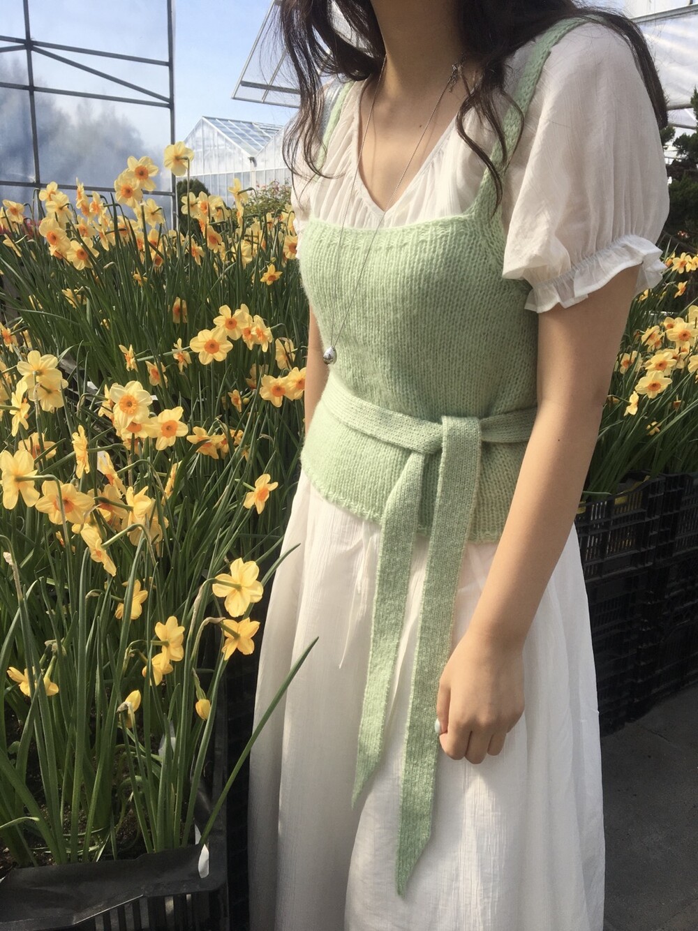 넥라인은 브이넥으로 디자인되어 답답함 없이 목선을 길어 보이게 만들어주고,앞부분에 더해진 스트링 디테일이 은은한 포인트가 되어줘요.