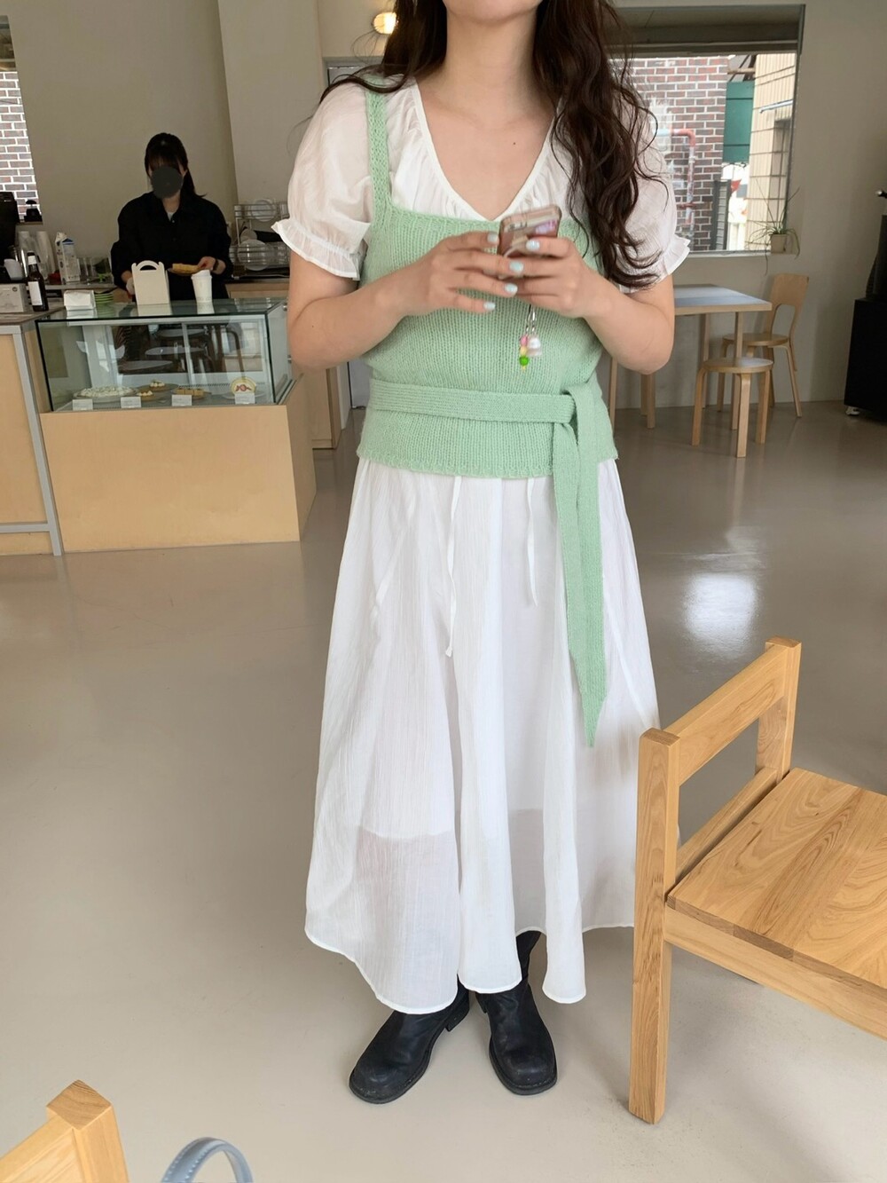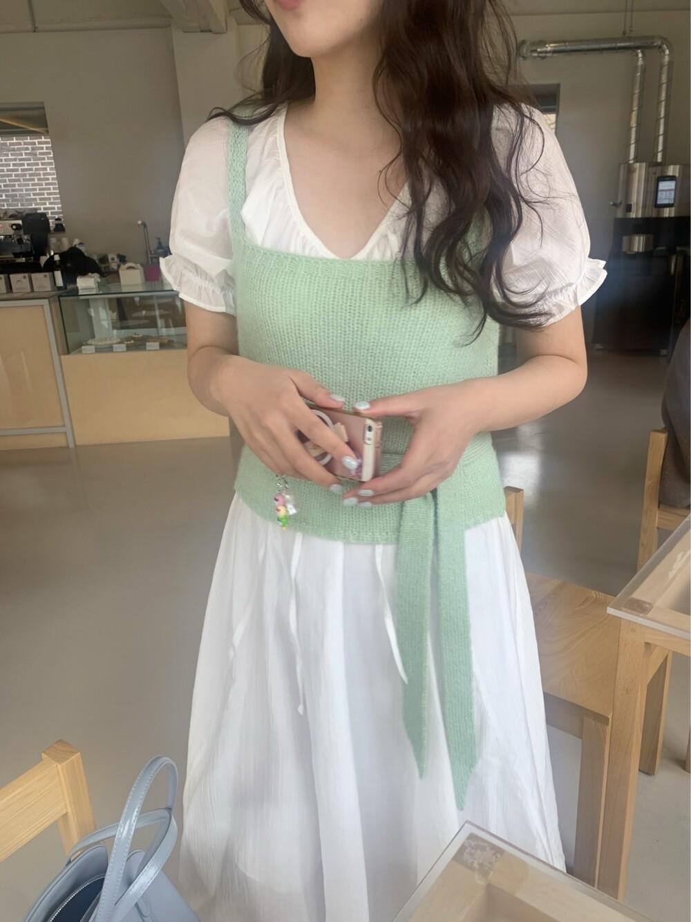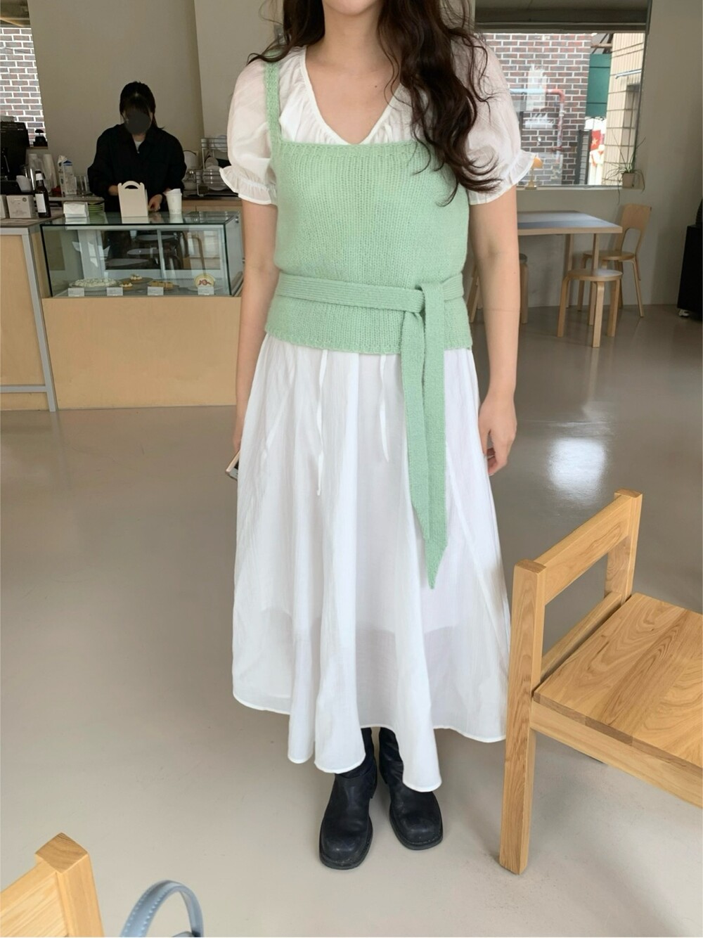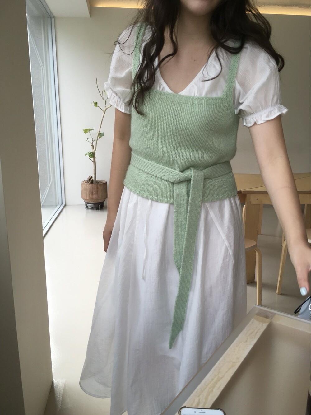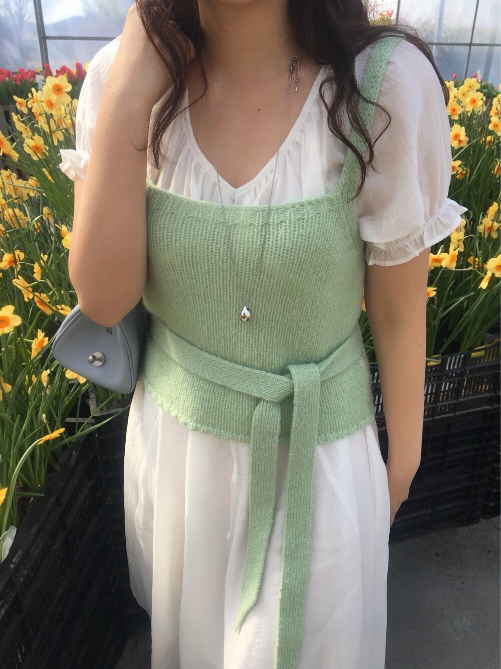 넥라인은 브이넥으로 디자인되어 답답함 없이 목선을 길어 보이게 만들어주고,앞부분에 더해진 스트링 디테일이 은은한 포인트가 되어줘요.