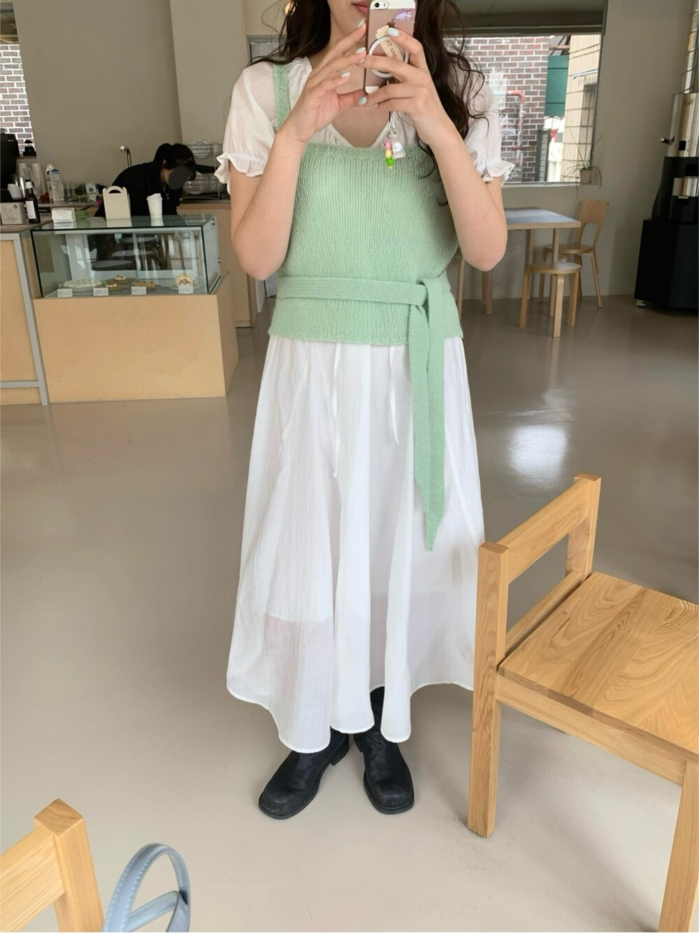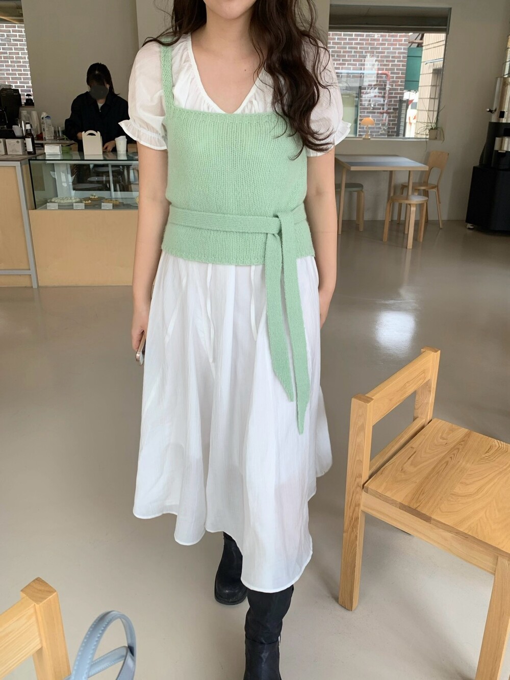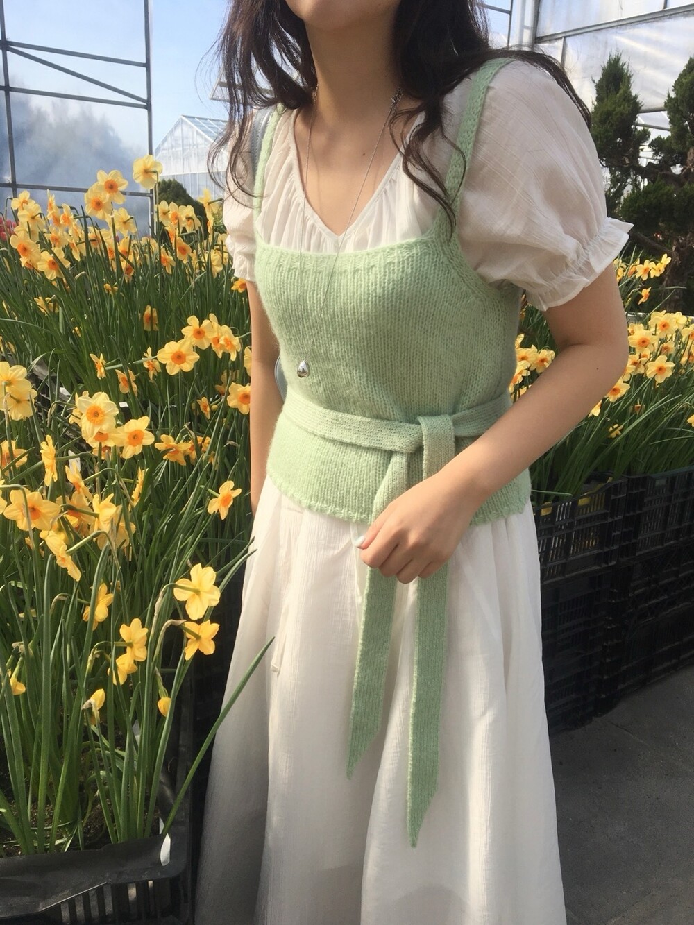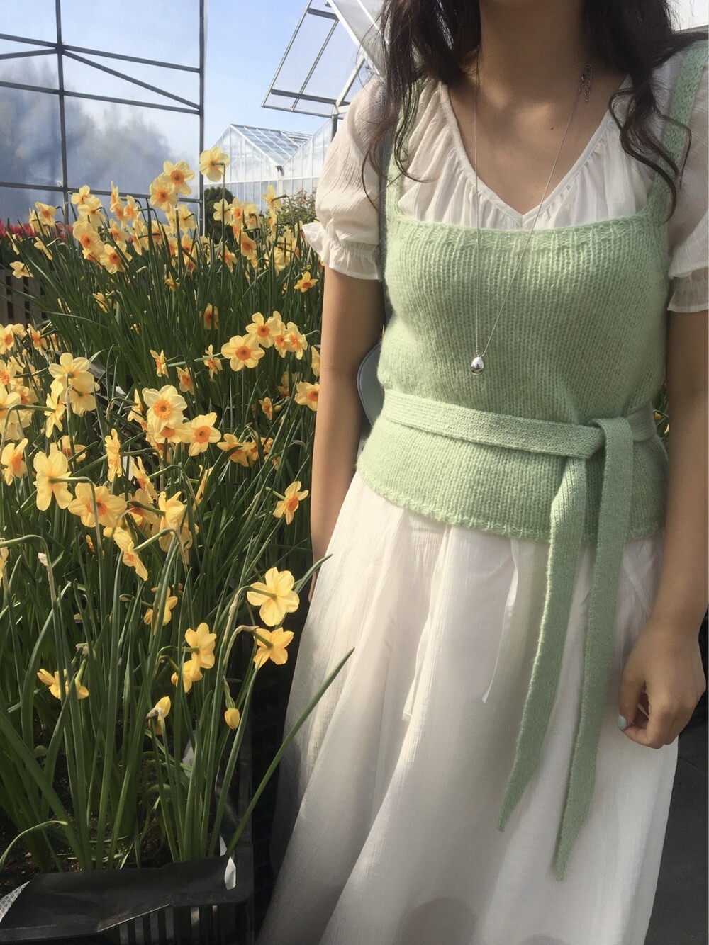 넥라인은 브이넥으로 디자인되어 답답함 없이 목선을 길어 보이게 만들어주고,앞부분에 더해진 스트링 디테일이 은은한 포인트가 되어줘요.