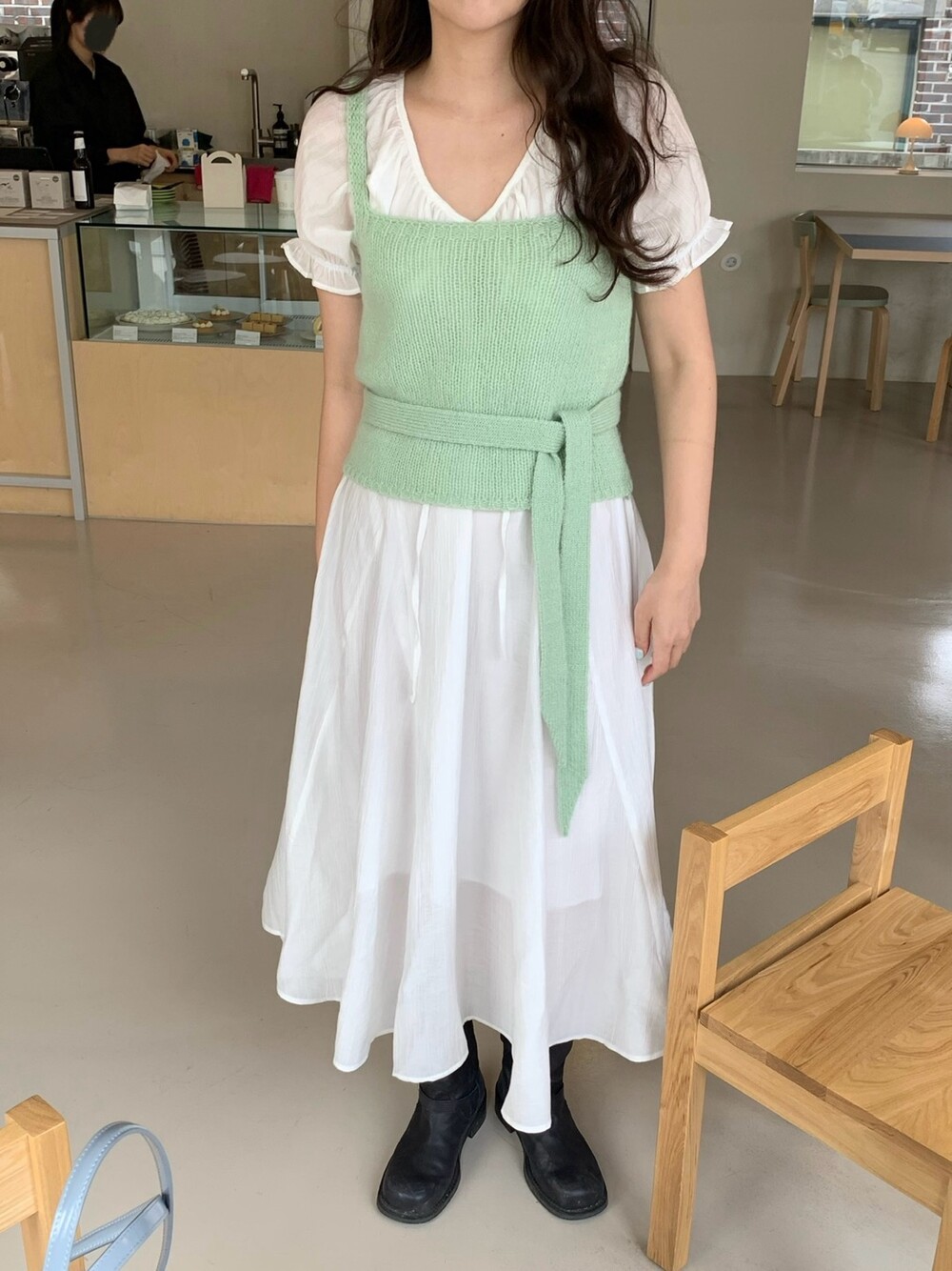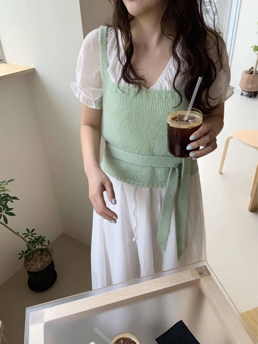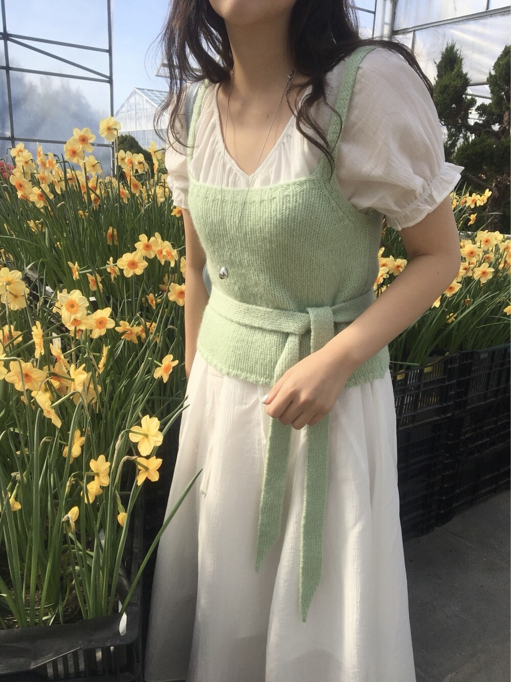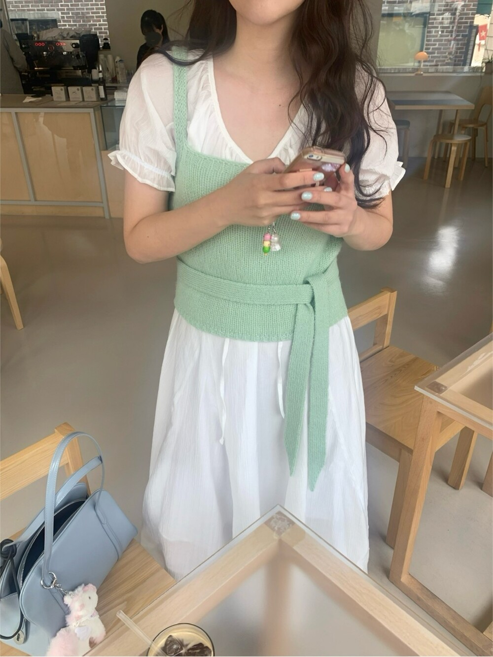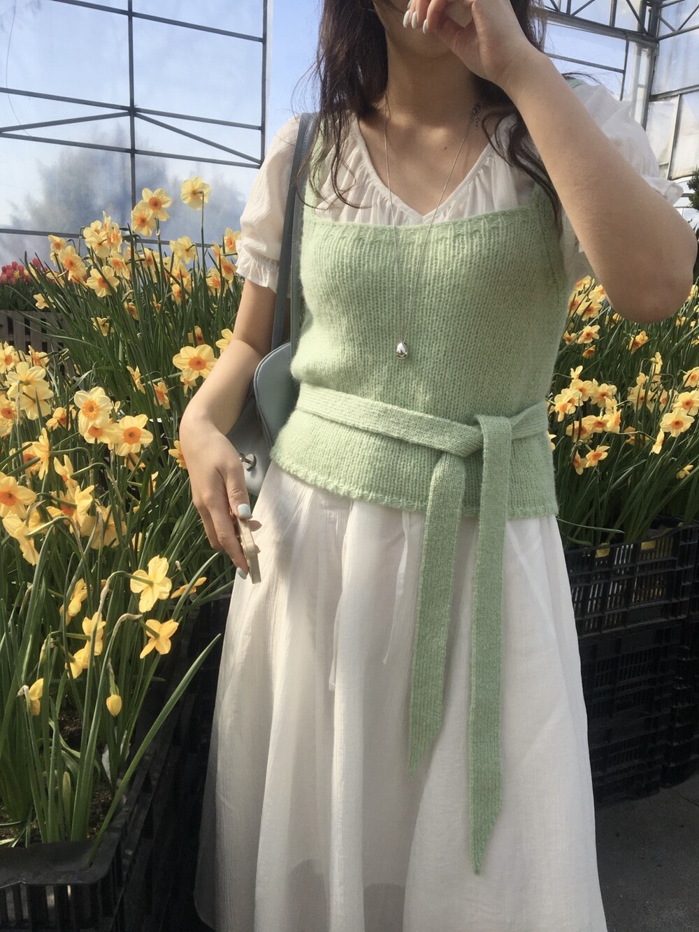 넥라인은 브이넥으로 디자인되어 답답함 없이 목선을 길어 보이게 만들어주고,앞부분에 더해진 스트링 디테일이 은은한 포인트가 되어줘요.