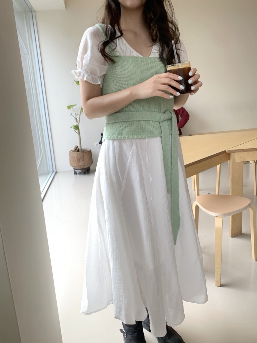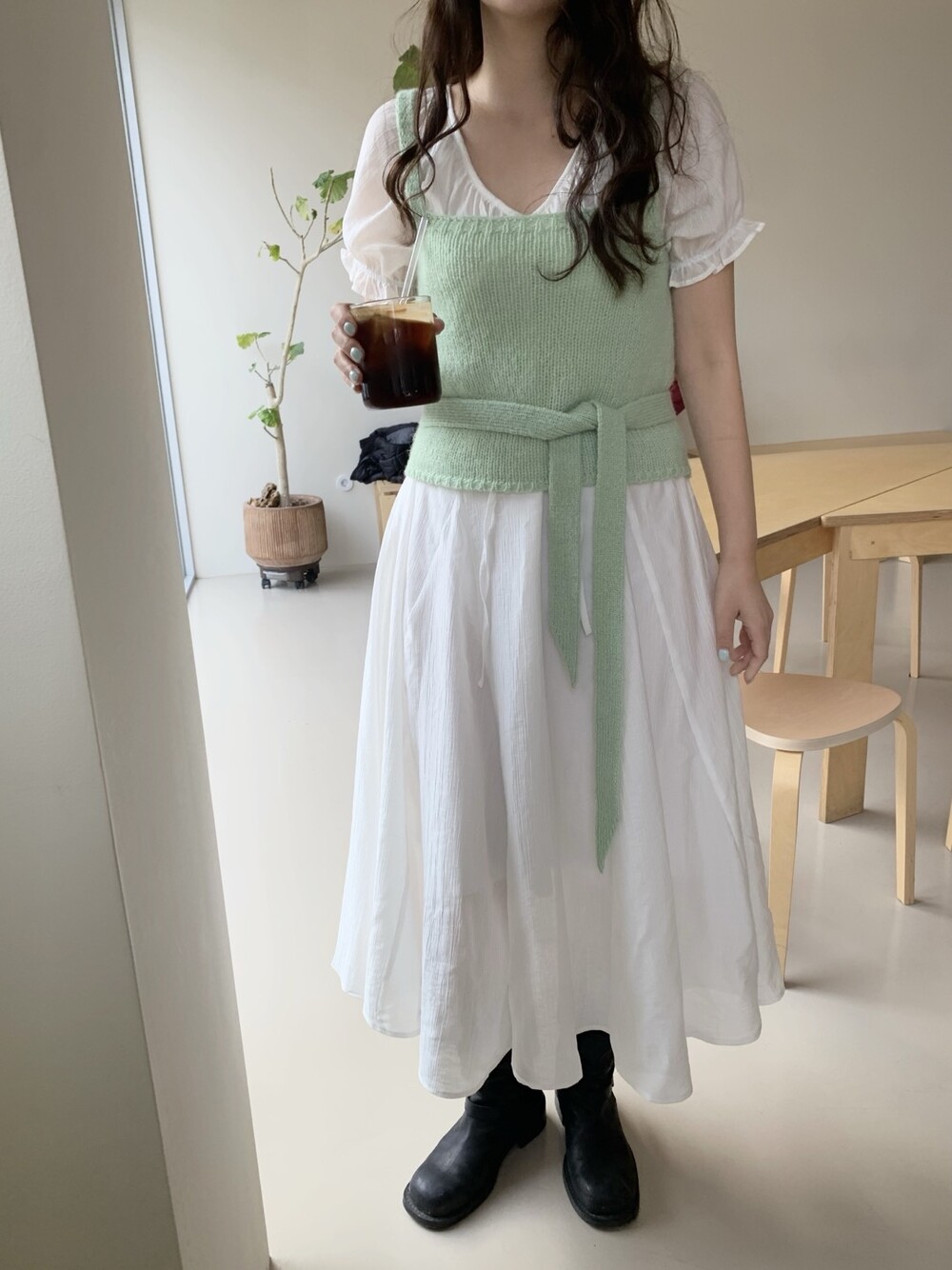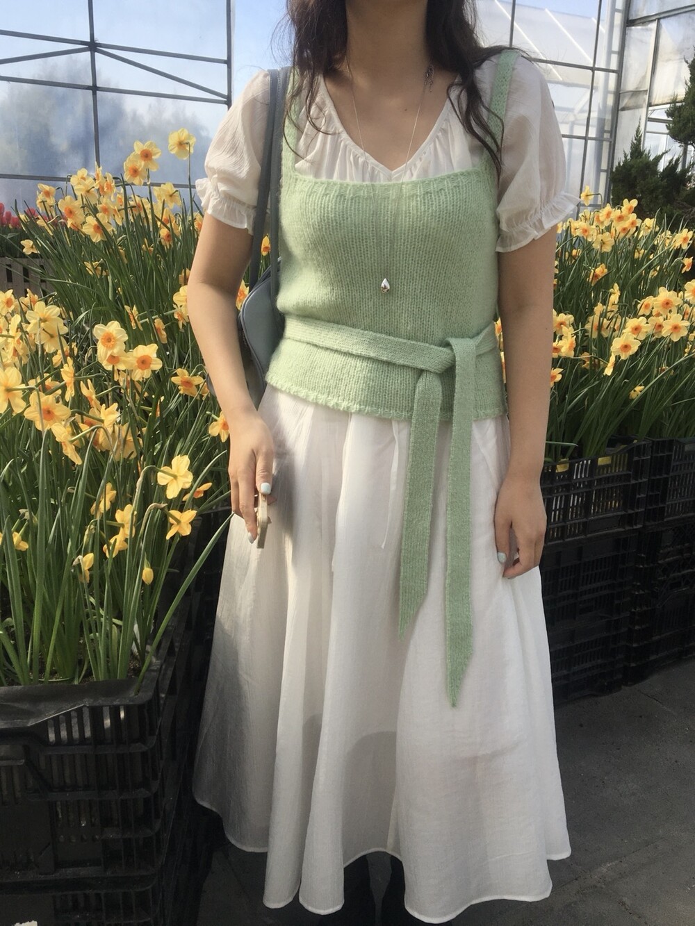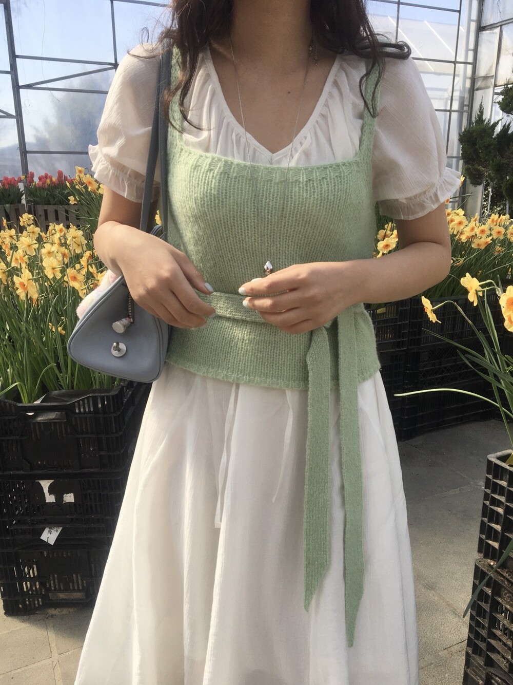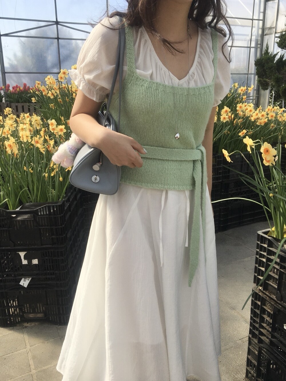 넥라인은 브이넥으로 디자인되어 답답함 없이 목선을 길어 보이게 만들어주고,앞부분에 더해진 스트링 디테일이 은은한 포인트가 되어줘요.
