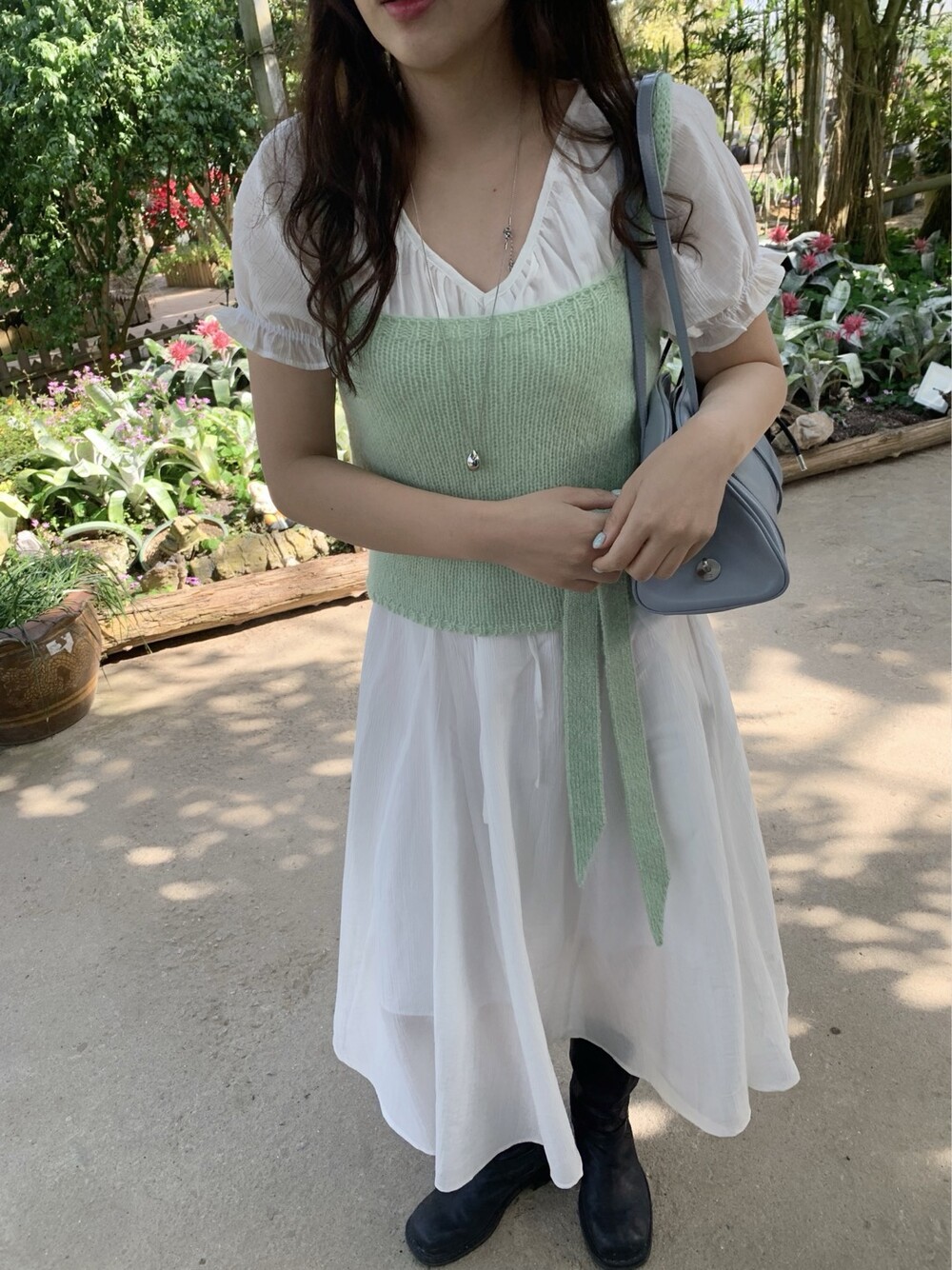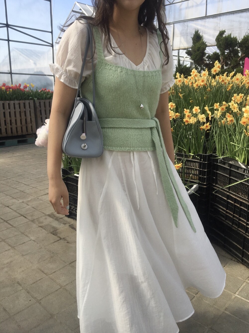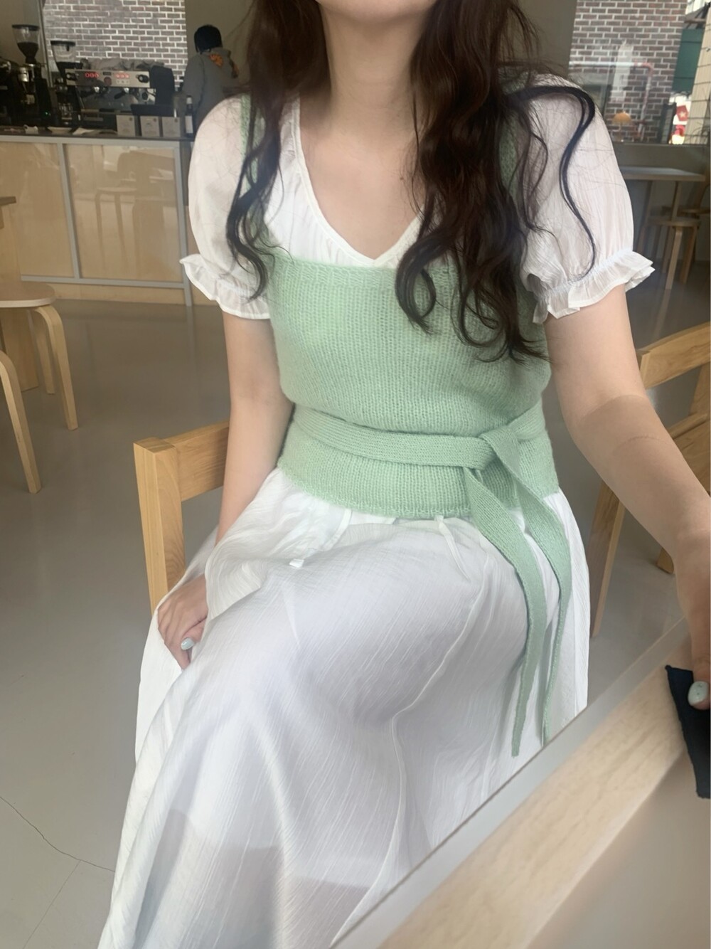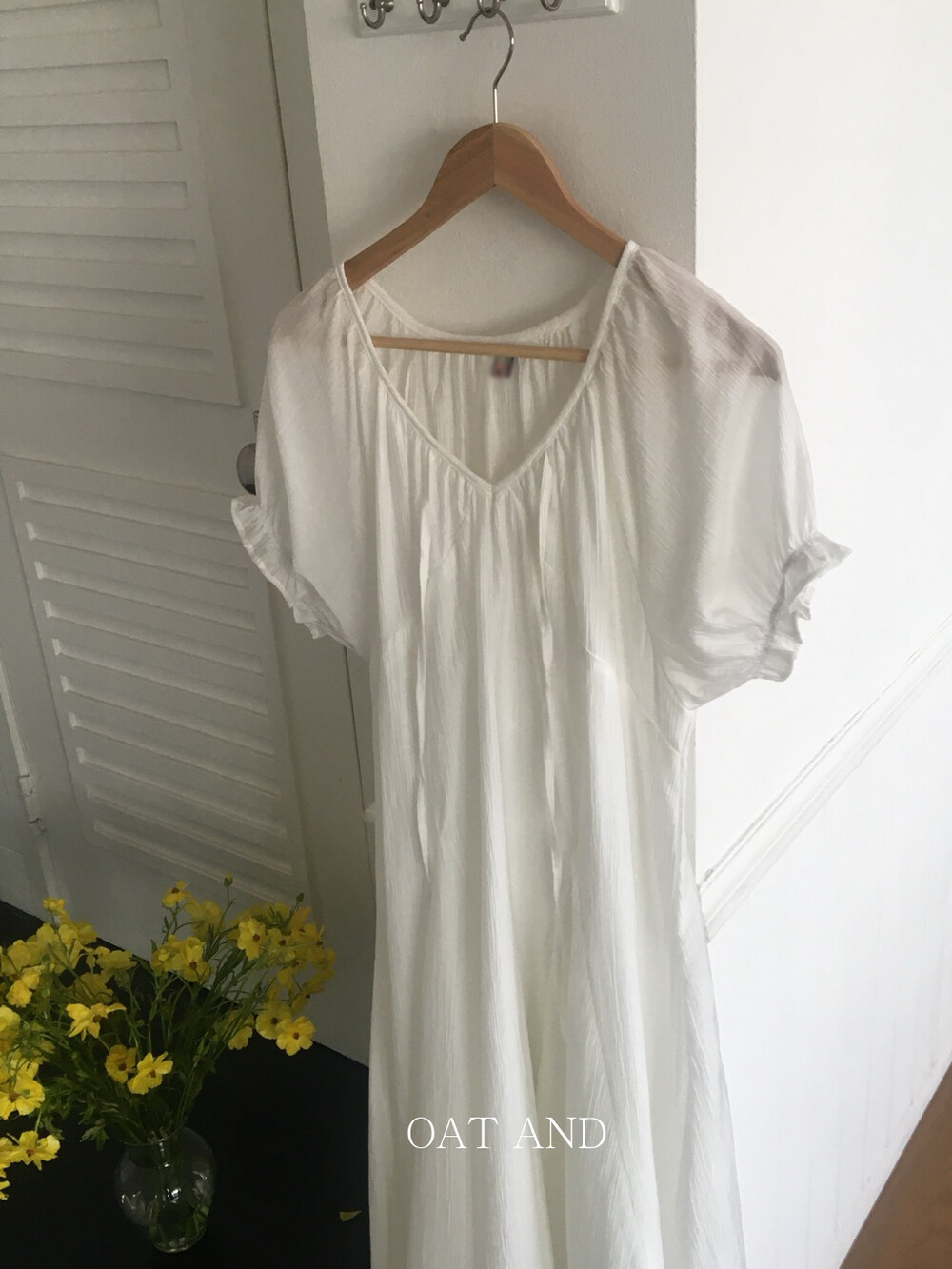 넥라인은 브이넥으로 디자인되어 답답함 없이 목선을 길어 보이게 만들어주고,앞부분에 더해진 스트링 디테일이 은은한 포인트가 되어줘요.
