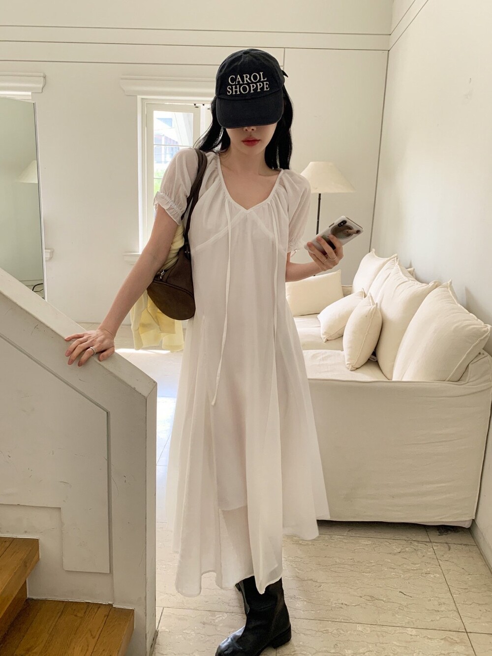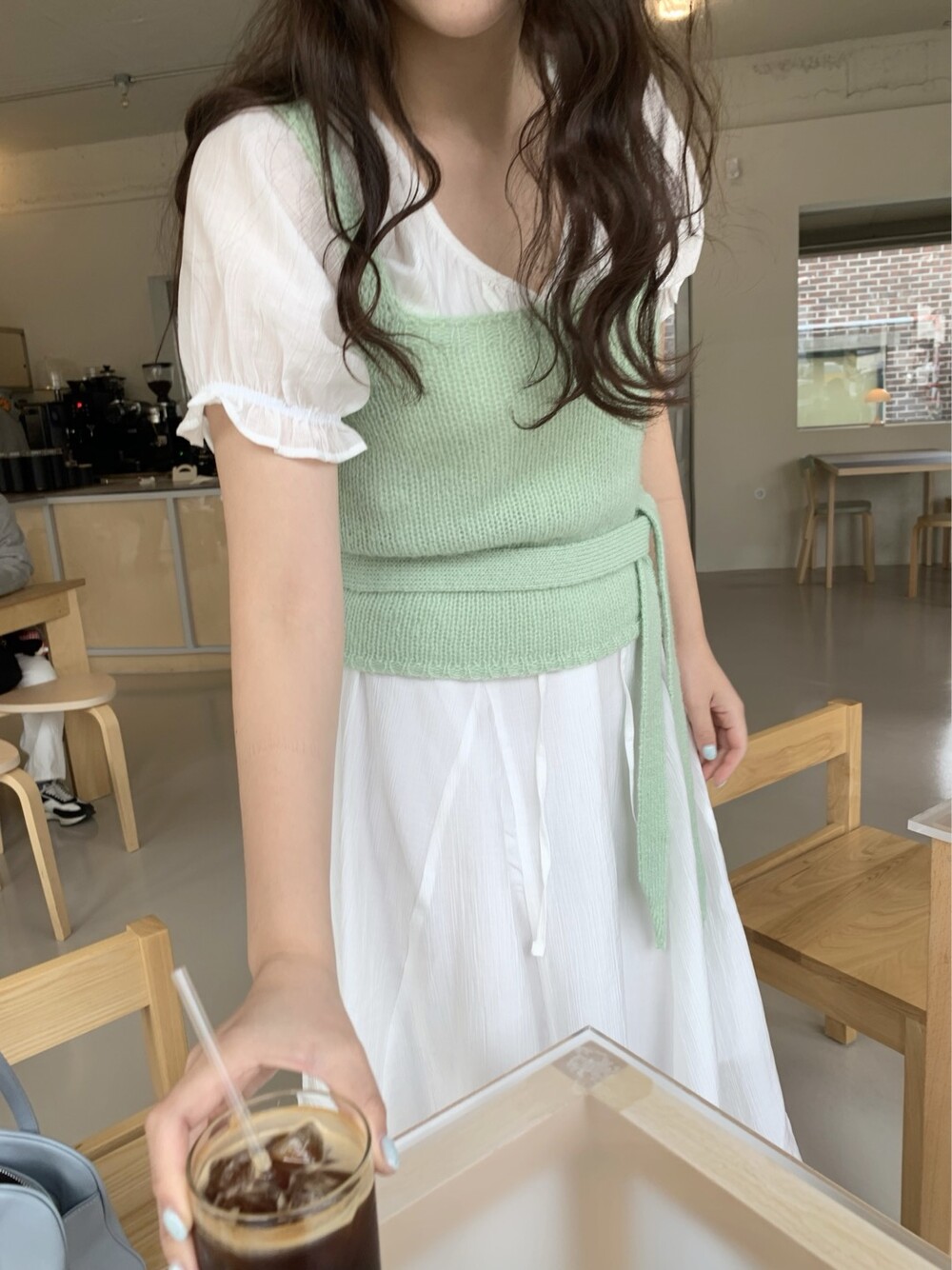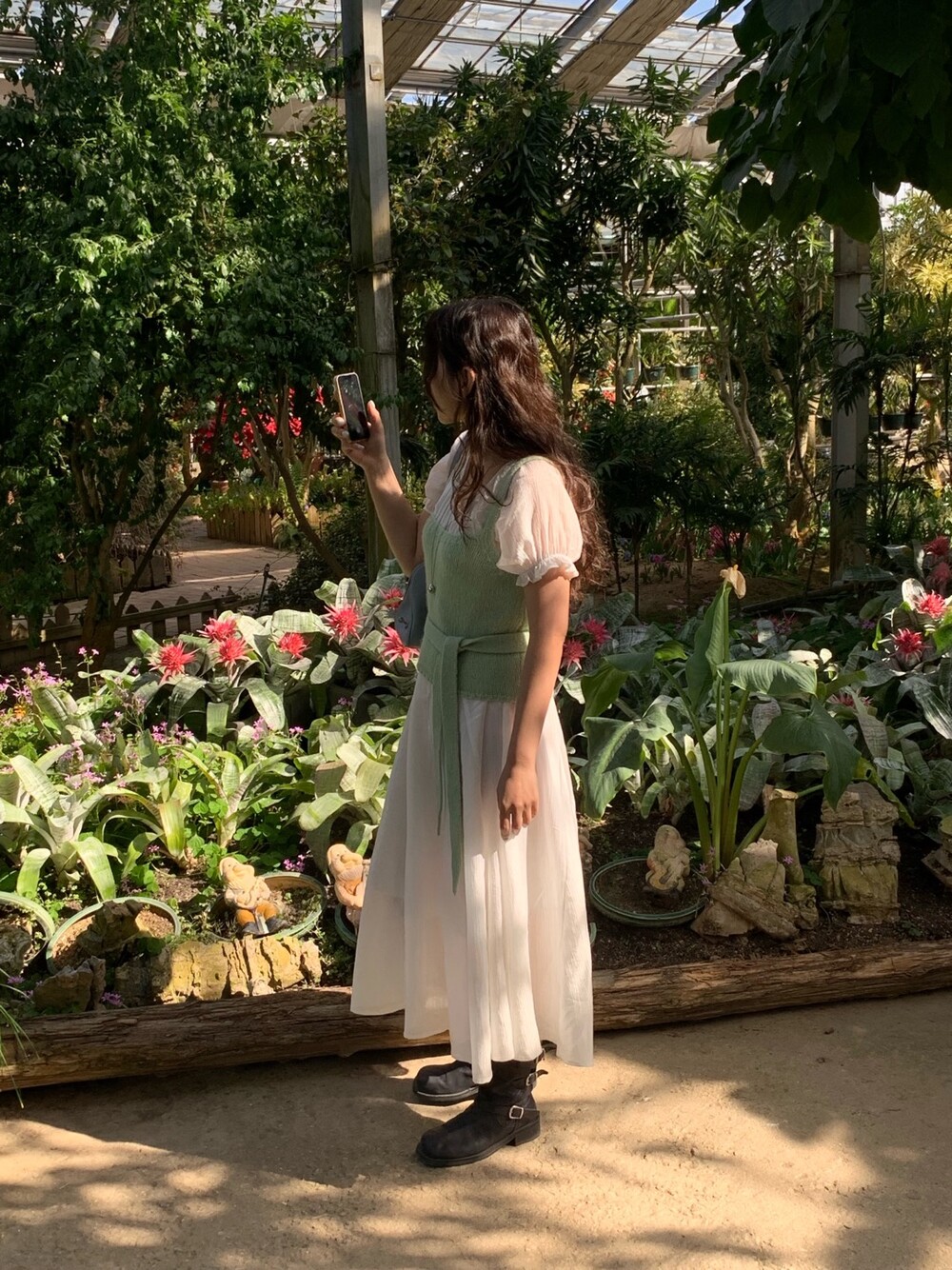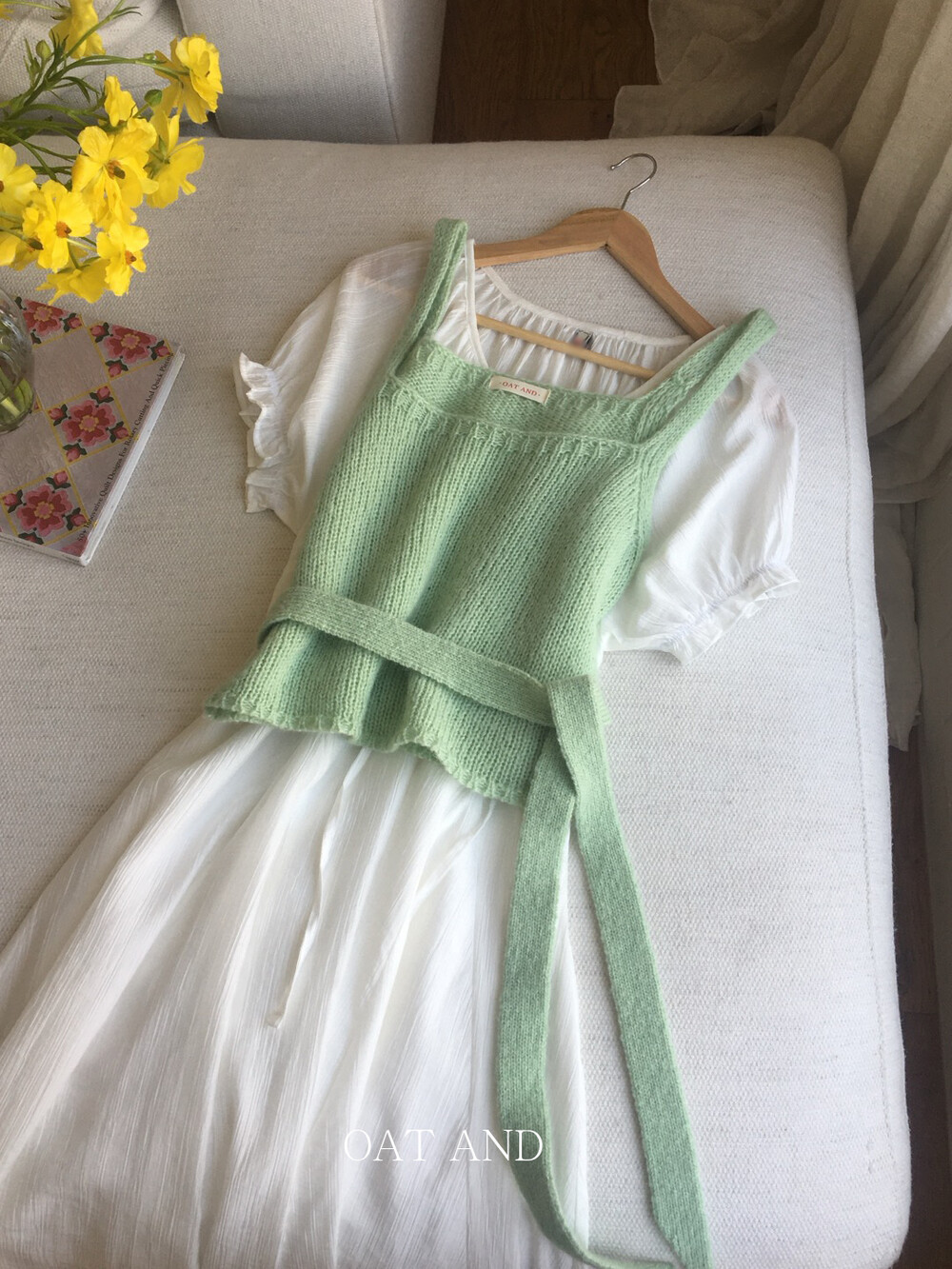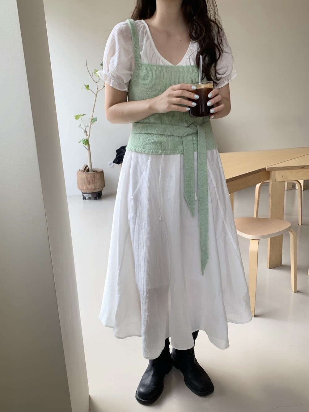 넥라인은 브이넥으로 디자인되어 답답함 없이 목선을 길어 보이게 만들어주고,앞부분에 더해진 스트링 디테일이 은은한 포인트가 되어줘요.