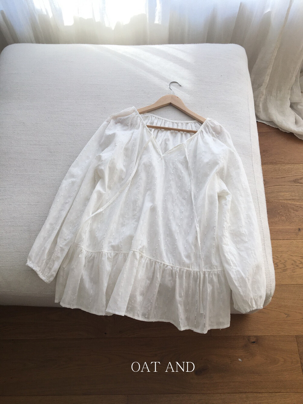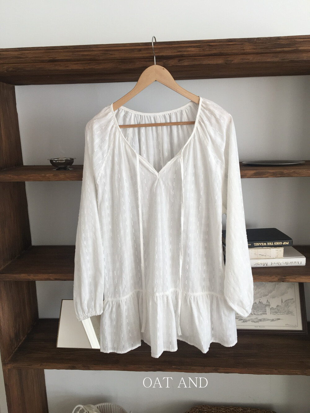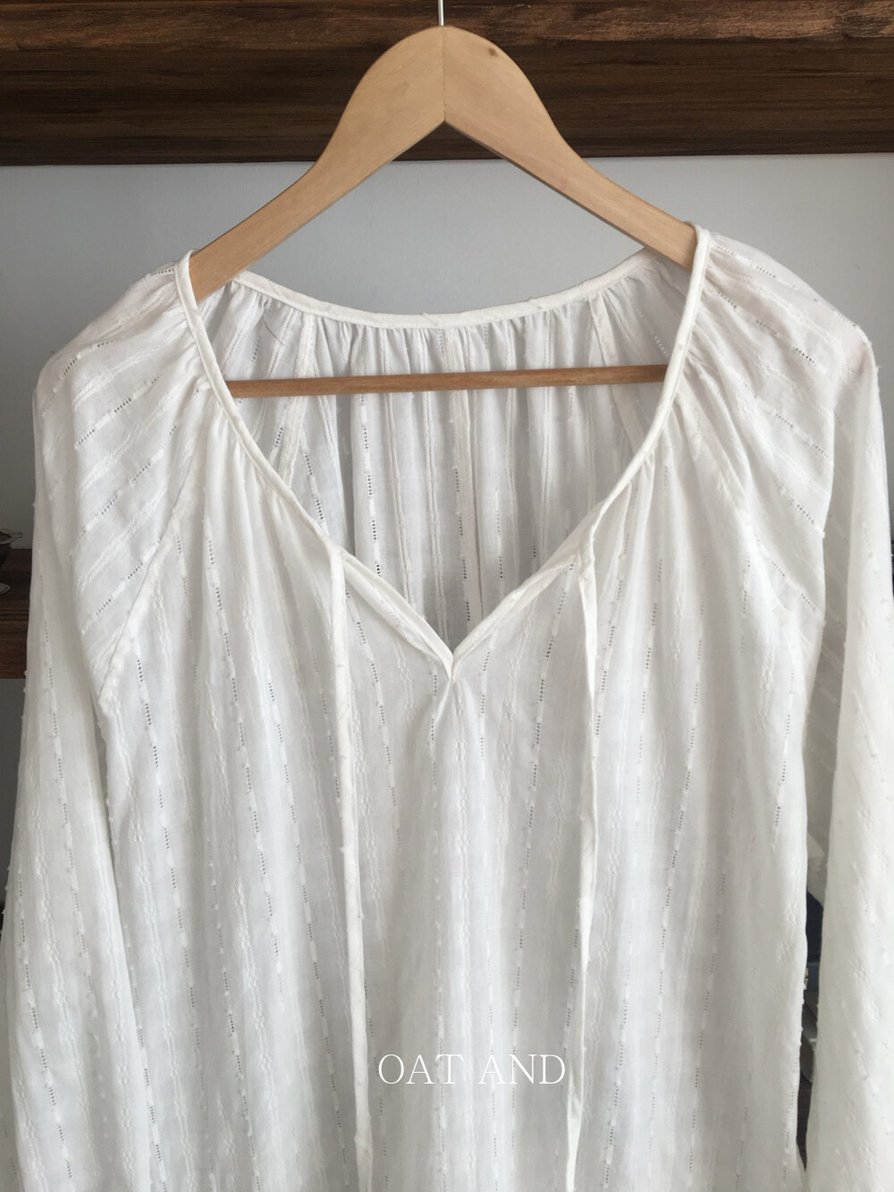 깊지 않은 브이넥에 얇은 끈(스트랩) 디테일이 있어, 리본으로 묶어 사랑스럽게 연출하거나 자연스럽게 풀어 내추럴한 무드로 입을 수 있습니다.
