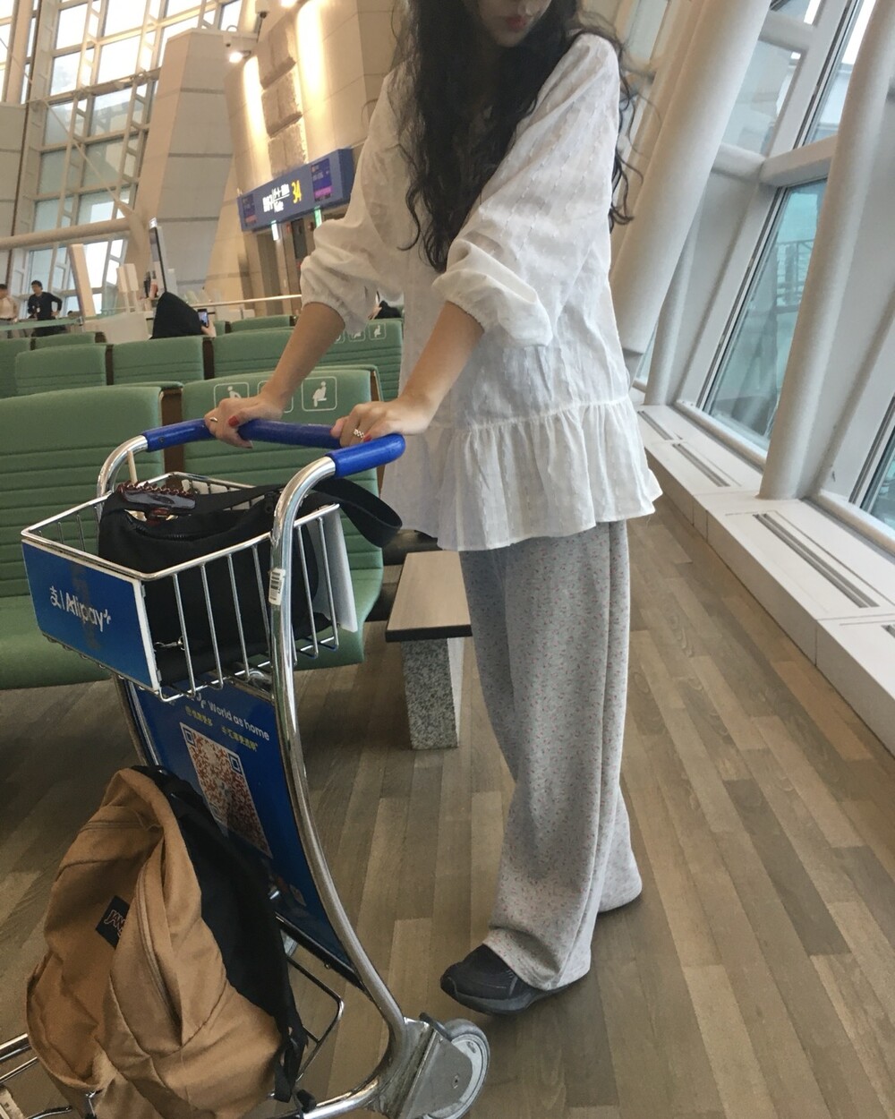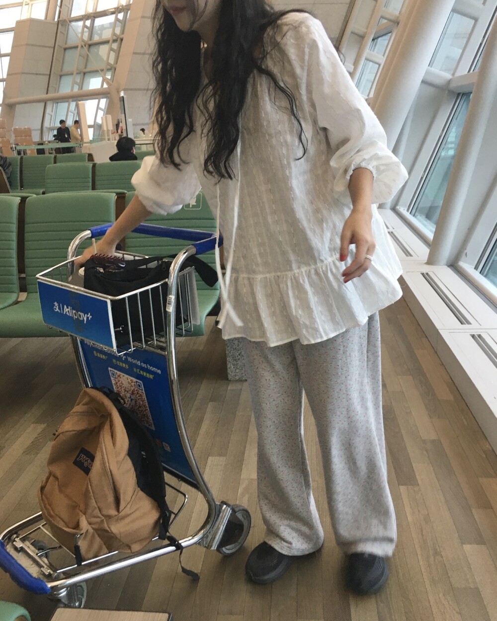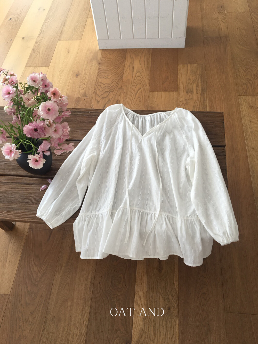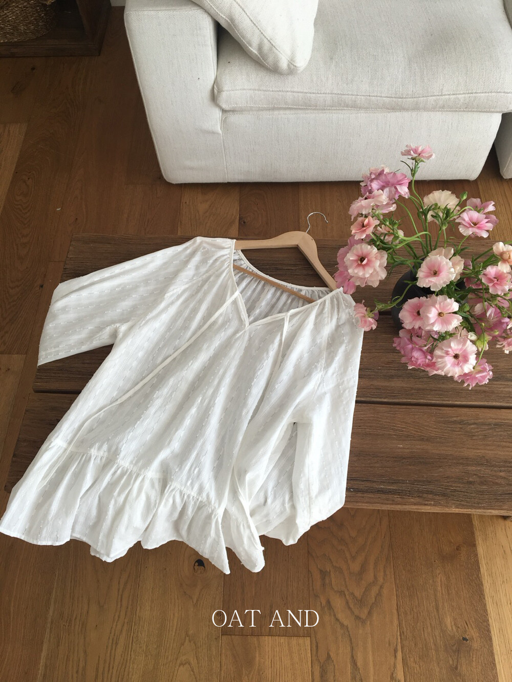 깊지 않은 브이넥에 얇은 끈(스트랩) 디테일이 있어, 리본으로 묶어 사랑스럽게 연출하거나 자연스럽게 풀어 내추럴한 무드로 입을 수 있습니다.